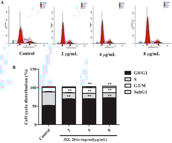 The effects of 3EZ, 20Ac-ingenol on L-O2 cell cycle using flow cytometer: (A) cell cycle distribution; and (B) cell number percentage in each phase (subG1, G0/G1, S and G2/M) were detected and calculated. Quantification of apoptotic cells were analyzed and expressed. Data are presented as mean ± SD from triplicate samples, ** P < 0.01 compared with control group.