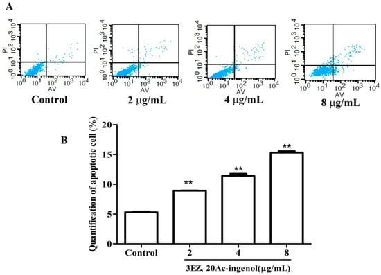 Apoptotic cell death was measured by Annexin V-FITC and PI double staining followed by flow cytometry [49,50]. After L-O2 cells were exposed to 3EZ, 20Ac-ingenol at the concentration of 2, 4, 8 μg/mL for 48 h in 6-well plates, cells were staining with Annxin V-FITC/PI Kit according to the manufacturer′s instructions and then analyzed with a flow cytometer. All experiments were performed in triplicate, and for each measurement, at least 20,000 cells were counted.