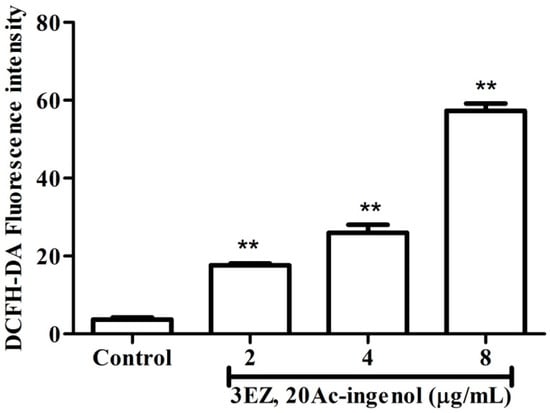 The effects of 3EZ, 20Ac-ingenol on ROS generationin L-O2 cells using DCFH-DA staining by laser scanning confocal microscope. Quantification of intracellular ROS fluorescence intensity were analyzed and expressed. Data are presented as mean ± SD from triplicate samples, ** P < 0.01 compared with control group.