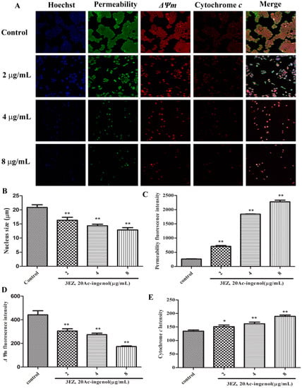 The mitochondrial function induced by 3EZ, 20Ac-ingenol in apoptotic hepatocyte L-O2 cells (×100). (A) Images of cells were taken by the high content screening (HCS) Assay Scan VTI Reader. (B) The average cell nuclear size was stained by Hoechst 33342 and quantified by the HCS Assay Scan software. (C) The cell membrane permeability was manifested by the average intensity of fluorescent dyes permeabilized through cell membranes. (D) The cell mitochondrial membrane potential (ΔΨm) was manifested by the average intensity of mitochondrial membrane potential fluorescent dyes. (E) The release of cytochrome c from mitochondria was manifested by the average cytochrome c intensity of fluorescent dye. Data are presented as mean ± SD from triplicate samples, * P < 0.05, ** P < 0.01 compared with control group.