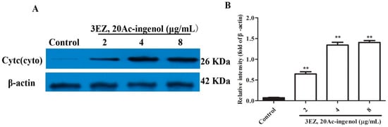 The effects of 3EZ, 20Ac-ingenol on the expression of cytc (cyto). L-O2 cells were incubated with 2, 4 and 8 μg/mL of 3EZ, 20Ac-ingenol for 48 h, and then cytc (cyto) was assessed via Western blotting (A). Quantification of cytc (cyto) was analyzed and expressed (B). Values are expressed as mean ± SD from three independent experiments, ** P < 0.01 compared with control group.