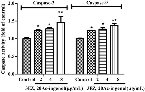 Subsequently, despite varying conditions under which apoptosis can occur, caspase activation is a universal event, and, for that reason, is considered an apoptotic marker. In the current study, as detected by ELISA assay, this study showed that the caspase-3 and caspase-9 (P < 0.05) activities were markedly increased in 3EZ, 20Ac-ingenol group compared with control group (Figure 8).