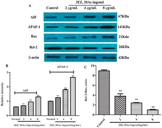 The molecular mechanism by which 3EZ, 20Ac-ingenol induced L-O2 cell apoptosis was investigated. Apoptosis-inducing factor (AIF) is essential for programmed cell death in early morphogenesis during embryogenesis [25]. Many kinds of cytotoxic injuries that induce AIF translocation to the nucleus have been reported [26,27,28]. The present study showed that 3EZ, 20Ac-ingenol could significantly increase AIF expression (P < 0.01) (Figure 9A,B). Apoptotic protease-activating factor 1 (APAF-1) is one of the key regulators in the mitochondrial apoptotic pathway. APAF-1 binds to a protein called cytochrome c, which is released from mitochondria and this complex activates caspase-9, which then triggers executioner caspases, leading to apoptosis [29]. This study showed that 3EZ, 20Ac-ingenol apparently increases the protein of APAF-1 (P < 0.01) (Figure 9A,B), suggesting that this regulator was involved in 3EZ, 20Ac-ingenol effects. Alternatively, this study turned to Bcl-2/Bax ratio that control apoptotic signal transduction. Since the Bcl-2/Bax ratio is critical for regulating the release of cytocrome c from mitochondria, the potential involvement of the Bcl-2 family proteins in the process of 3EZ, 20Ac-ingenol mediated hepatocyte apoptosis was investigated. As shown in Figure 9A,C, compared with control group, 3EZ, 20Ac-ingenol-treated cells showed an obviously decreased Bcl-2/Bax protein ratio (P < 0.01). Collectively, these data indicated that 3EZ, 20Ac-ingenol could activate AIF and APAF-1 expression and down-regulate Bcl-2/Bax ratio leading to mitochondrial-dependent pathway apoptosis in L-O2 cells.