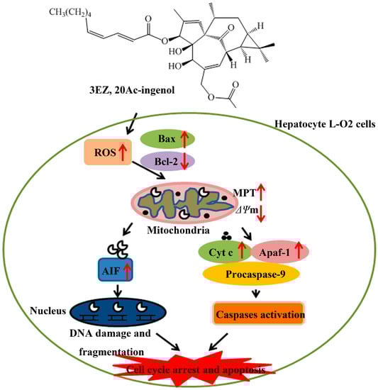 Oxidative stress caused by ROS controls the expression of Bcl-2 family proteins [42] and plays a key role in the induction of apoptosis [43,44]. Excessive ROS destroyed the mitochondrial membrane integrity, leading to cytochrome c and AIF release, caspase activation and finally apoptosis [45]. The present study demonstrated that 3EZ, 20Ac-ingenol could elevate ROS, regulate the expression of Bcl-2/Bax, promote mitochondrial dysfunction, release of cytochrome c and AIF and finally activate the caspases. Taken together, based on our observations, a simplified mode was proposed in Figure 10 to describe the mechanisms of 3EZ, 20Ac-ingenol induction of cell mitochondrial apoptosis in hepatocyte L-O2 cells. Additional studies are ongoing in our laboratory to validate the present findings in vivo.