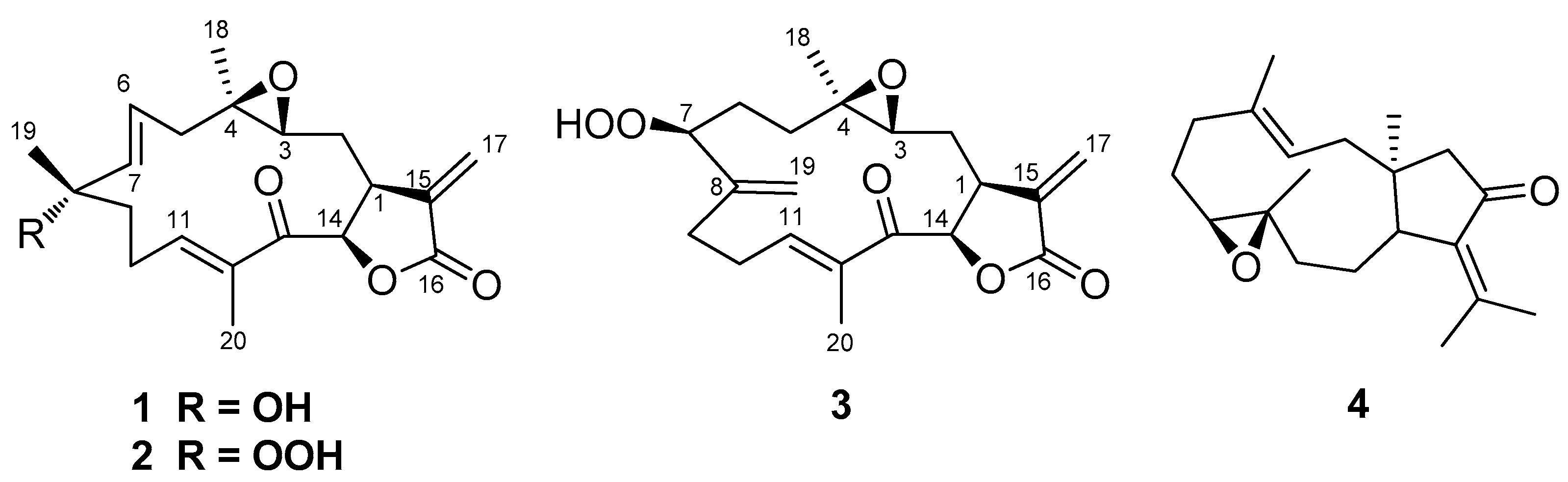 - Rodríguez, A.D.; Soto, J.J.; Piña, I.C. Uprolides D-G, 2. A rare family of 4,7-oxa-bridged cembranolides from the Caribbean gorgonian Eunicea mammosa. J. Nat. Prod. 1995, 58, 1209–1216. [Google Scholar] [CrossRef] [PubMed]
