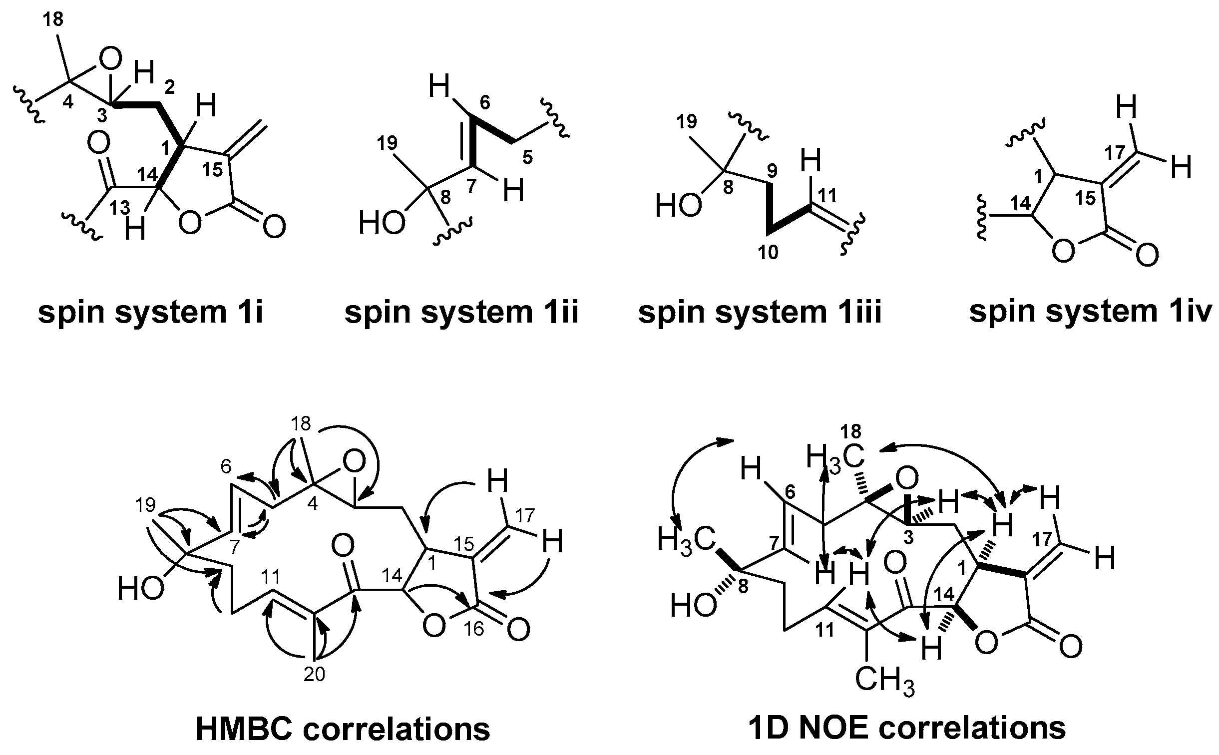 Four spin systems were developed on the basis of COSY experiments (Figure 2 and Figure S4). In spin system 1i, a deshielded doublet proton at δH 5.80, attached to an oxygen bearing carbon (C-14, δC 72.5), was adjacent to a midfield methine (C-1, δH 3.17, δC 41.7) with shifts consistent with its allylic nature. In turn, this latter resonance was adjacent to a methylene group (C-2, δH 1.74, δC 27.7) that was further coupled to an α-epoxy proton (C-3, δH 2.65, δC 56.3). In spin system 1ii, a doublet vinyl proton (C-7, δH 5.65, δC 140.7) was coupled to its olefinic partner (C-6, δH 5.34, δC 124.2) with a J value of 15.3 Hz, indicating the trans nature of this double bond [6,8]. The latter resonance was also coupled to an adjacent methylene group (C-5, δH 2.58/2.43, δC 39.2). The spin system 1iii was comprised of a significantly deshielded olefin proton (C-11, δH 6.81, δC 147.8) that was adjacent to a CH2-CH2 moiety (C-10, δH 2.40, δC 25.3; C-9, δH 1.97, δC 41.6). The final spin system 1iv was comprised of two olefinic protons at δH 6.28 (d, J = 3.3 Hz, H-17a) and 5.44 (d, J = 3.3 Hz, H-17b), and were assigned to an exocyclic methylene. In addition, the 1H-NMR spectrum for compound 1 showed signals for three methyl groups, two attached to sp3 quaternary carbons at δH 1.37 (s, H3-18) and 1.34 (s, H3-19) and one attached to a double bond at δH 1.83 (s, H3-20).