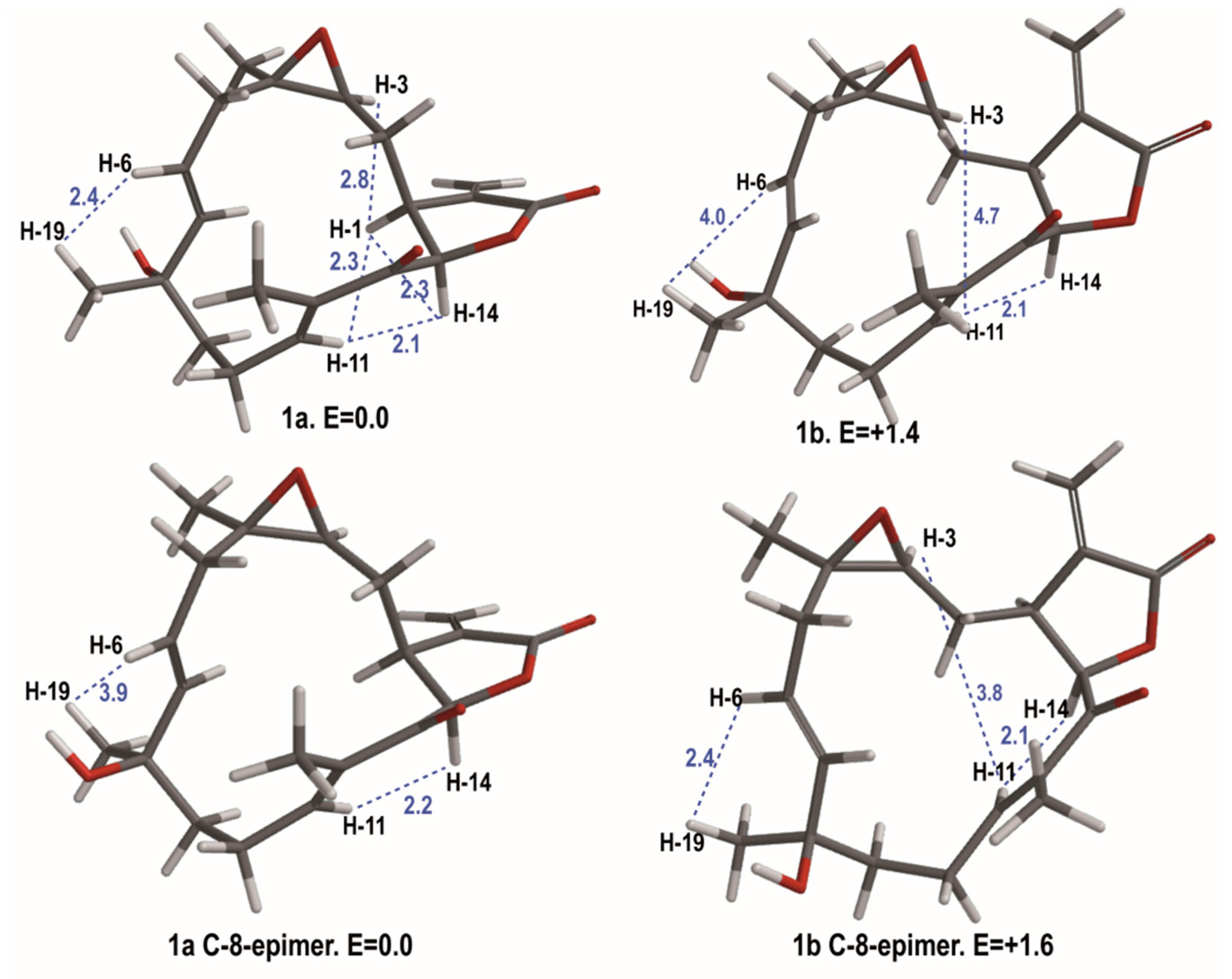 The two lower energy conformers for each C-8 epimer of uprolide N (1). Relative energies are expressed in Kcal∙mol−1. Selected distances (in blue) are given in Å.