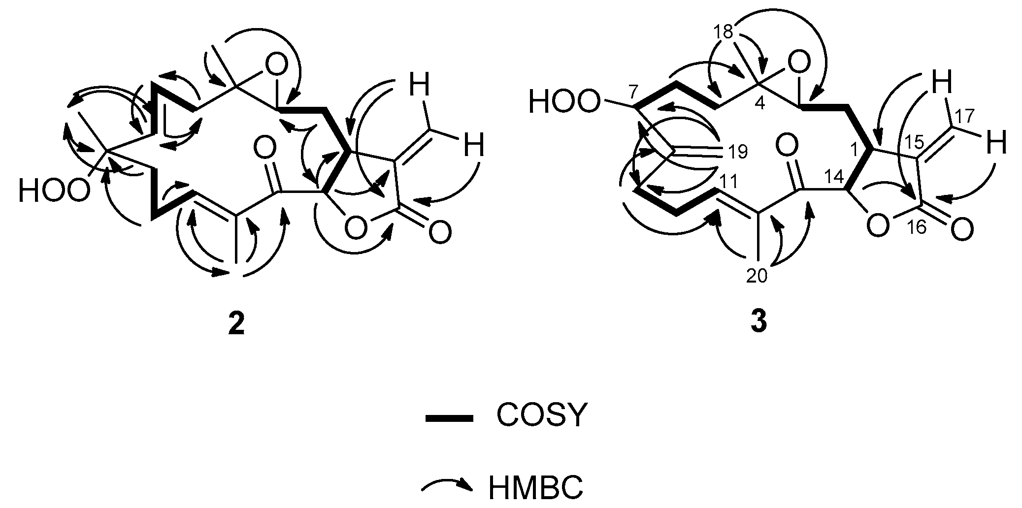 1H-1H-COSY and 1H-13C-HMBC correlations for compounds 2 and 3.