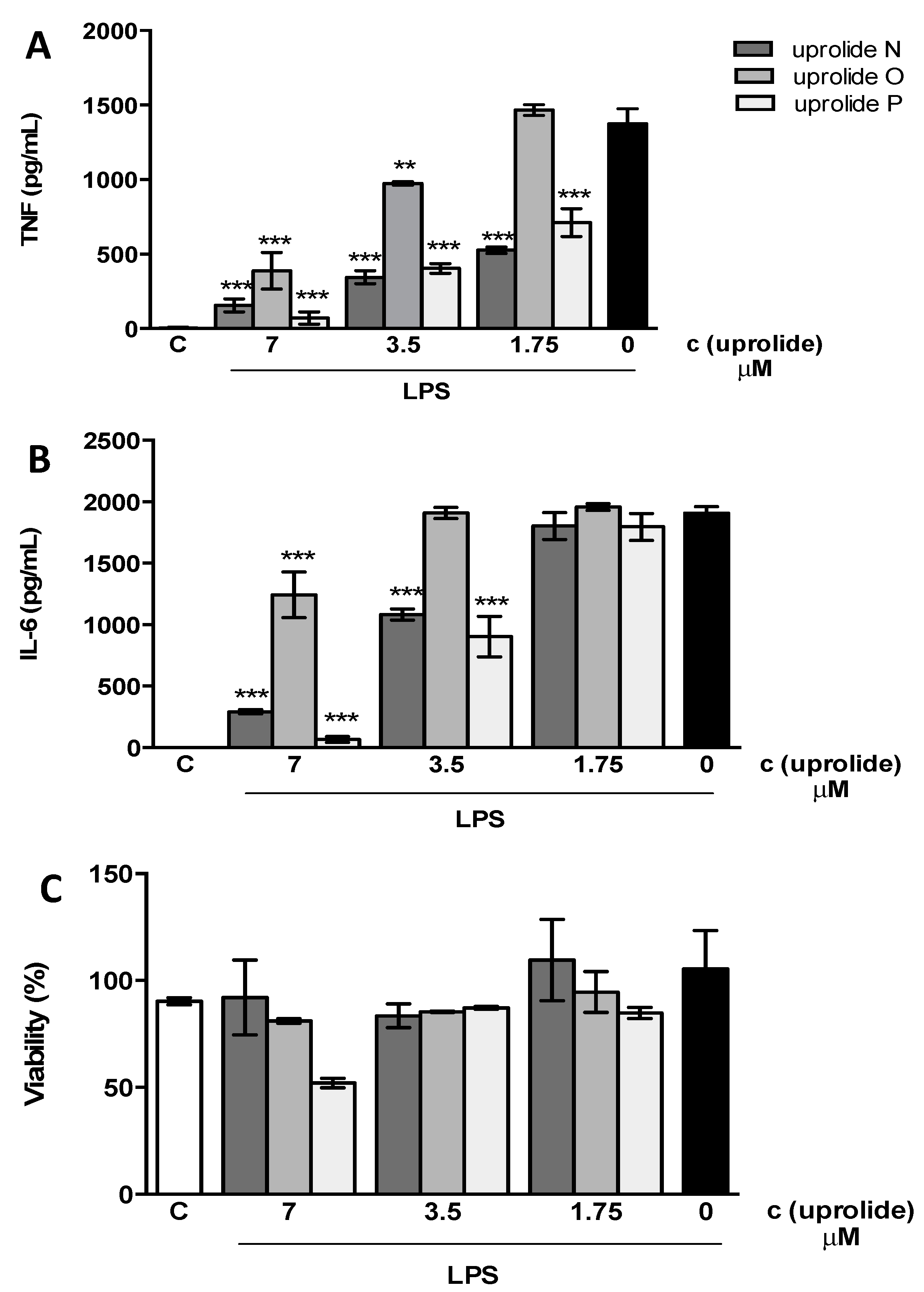Uprolides compounds inhibit the production of TNF (A) and IL-6 (B) induced by LPS in macrophages. Peritoneal macrophages from C57B1/6 mice were treated with different concentrations of compounds 1, 2 or 3 (uprolides N, O or P) 1 h before stimulation with 100 μg/mL of LPS. The supernatants were harvested after 6 h, and cytokine concentrations were determined by ELISA. Results are represented as Mean ± S.E.M. from two independent experiments performed in duplicate. **, p < 0.01, ***, p < 0.001 relative to the LPS stimulus alone. (C) The cell viability was assessed using a MTT assay after collecting the supernatant. Results are represented as Mean ± S.E.M. from stimuli performed in duplicate and are representative of two different experiments. C represents the control plus 0.5% of DMSO without the stimulus.