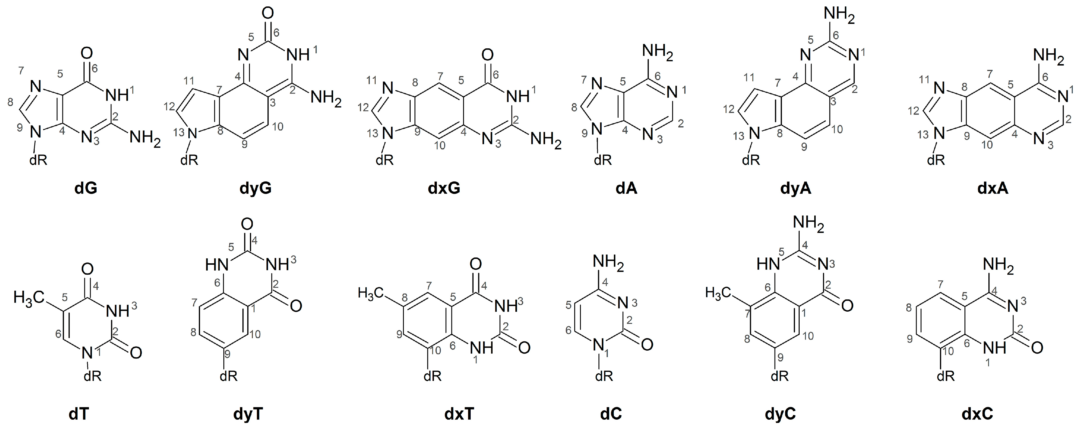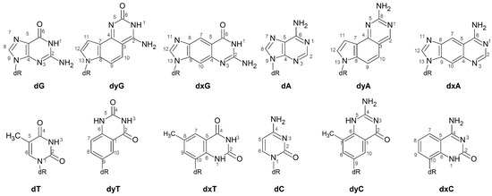 - Lee, A.H.F.; Kool, E.T. A new four-base genetic helix, yDNA, composed of widened benzopyrimidine-purine pairs. J. Am. Chem. Soc. 2005, 127, 3332–3338. [Google Scholar] [CrossRef] [PubMed]