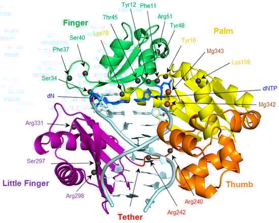 The finger, palm, thumb, and little finger domains of Dpo4, as well as the tether region. The positions of potentially important residues in each domain are indicated with spheres.