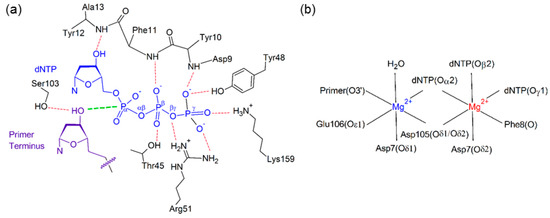 (a) Hydrogen-bonding interactions with the dNTP (blue) and primer terminus (purple), with the reaction distance shown in green; (b) Active site coordination of the catalytic (blue) and binding (red) Mg2+ ions.