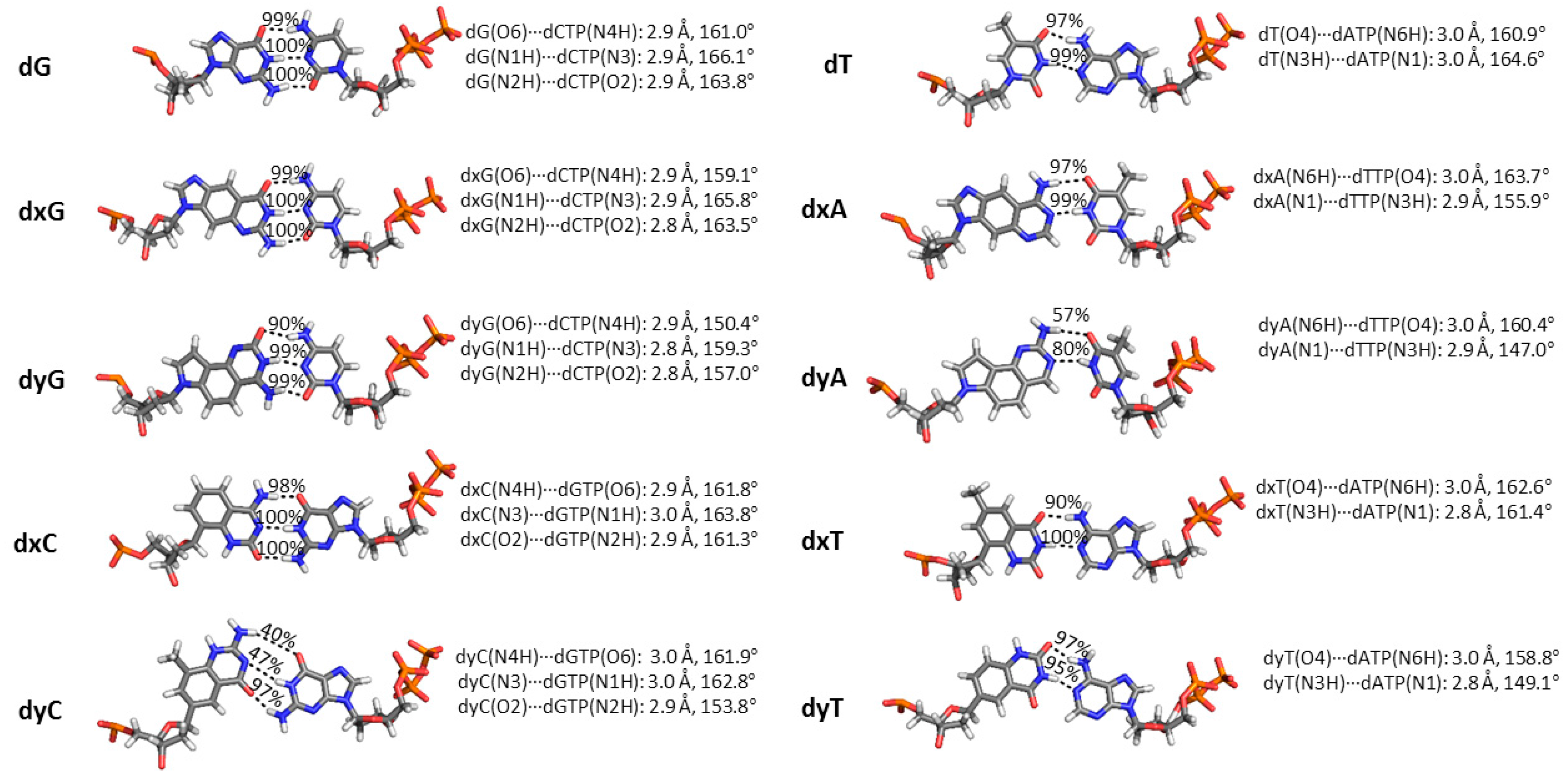 2.3. d(x,y)N:dNTP Hydrogen Bonding Does Not Significantly Deviate from Canonical Watson-Crick Interactions, with the Exception of dyA and dyC