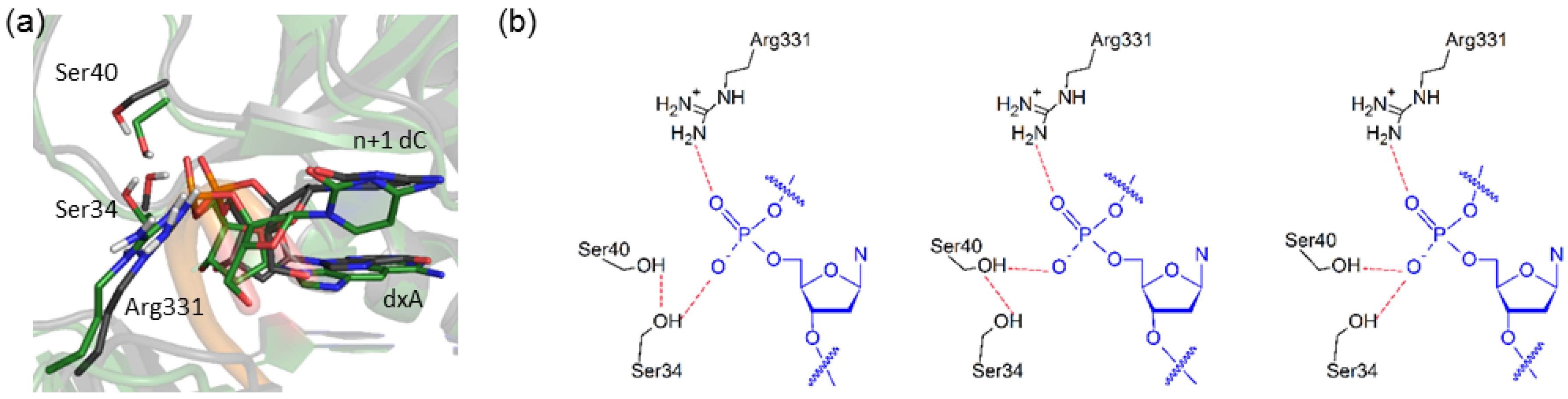 2.6. Residues Interacting with the Template Backbone Move to Accommodate the (x,y)DNA Bases
