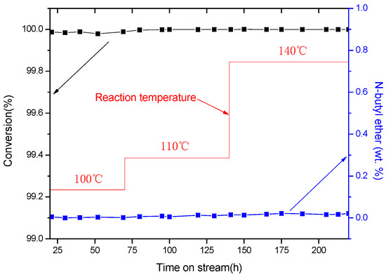 Long-term catalytic test for the Raney Ni/PA catalyst under a pressure of 4.0 MPa at different temperatures over 100–140 °C; red stepwise lines represent the temperature sequence used for the test [19]. Reproduced from Ref. [19] with permission from the Royal Society of Chemistry.