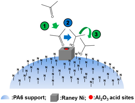 The isopropyl ether byproduct was generated from the main product isopropanol, catalyzed by acidic Al2O3 (Reaction (2)). Once adsorbed by the remaining Al2O3 inside the pores of Raney Ni, isopropanol would be catalytically converted to the byproduct isopropyl ether. As already noted, the PA6 support possesses strong adsorption ability for the -OH groups of isopropanol. Therefore, as shown in Figure 5, once produced, isopropanol was selectively adsorbed by N atoms in the PA6, rather than the acidic Al atoms inside the pores of Raney Ni. Unlike the acidic Al atoms in Al2O3, the basic N atoms in the PA6 support cannot catalyze the conversion of isopropanol to isopropyl ether. Clearly, it was also the interplay of the alkalinity and strong adsorption ability to isopropanol intrinsically associated with the N atoms in the PA6 support that made the elimination of isopropyl ether possible.