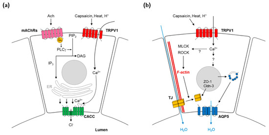 - Cong, X.; Zhang, Y.; Shi, L.; Yang, N.Y.; Ding, C.; Li, J.; Ding, Q.W.; Su, Y.C.; Xiang, R.L.; Wu, L.L.; et al. Activation of transient receptor potential vanilloid subtype 1 increases expression and permeability of tight junction in normal and hyposecretory submandibular gland. Lab. Investig. 2012, 92, 753–768. [Google Scholar] [CrossRef] [PubMed]