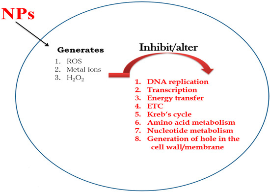 NPs can be synthesized by several different methods and do not exceed 100 nm in size. The size, chemical composition, and shape of these NPs depend on the method of synthesis. They may be organic or inorganic, and may comprise metal, polymer, ceramic, latex, or carbon-based particles [174]. However, the major challenge commonly encountered is to control the size and shape of monodispersed NPs with higher stability during synthesis. Interestingly, the interaction between NPs and living cells/tissues is affected by several factors, including their size, shape, and composition [217]. The ability of NPs to permeate is essential if they are to be useful as antimicrobial or drug-delivery agents [31]. The majority of the NPs synthesized to date have the capacity to permeate membrane cells and spread to different regions of the body, such as blood vessels, nerve cells, and the lymphatic vascular system. However, NPs have potential health threats owing to selective accumulation in different cells, tissues, and certain cellular structures [174,217].