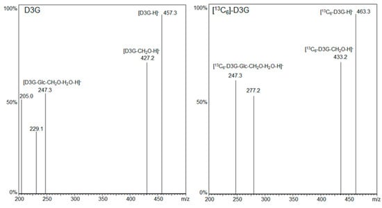 LC-MS/MS fragmentation spectra of D3G and [13C6]-D3G.