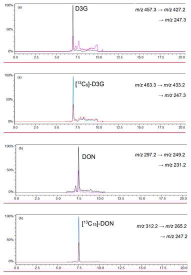 A ratio of 0.8 mL beer and 4 mL acetonitrile was chosen to precipitate polar matrix compounds in beer and to follow the recommendations of the manufacturer for loading the cartridge [36,37]. Polar matrix compounds in beer were precipitated after mixing the chosen beer and an acetonitrile volume of 0.8 mL and 4 mL, respectively. An overload of the cartridges was not observed with a total sample volume of 4.8 mL. After evaporation of the eluates until dryness and reconstitution of the sample with 200 μL acetonitrile/water (1/1, v/v) a lightly yellow colored clear sample resulted. The LC-MS/MS chromatograms of beer samples revealed low noise signals that did not interfere or overlap with the signals of the analytes and labeled standards. Figure 3 shows a LC-MS/MS chromatogram of D3G and DON as well as their labeled standards [13C6]-D3G and [13C15]-DON in a naturally-contaminated beer sample.