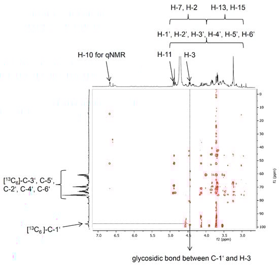 The structural elucidation of the product [13C6]-D3G was performed by NMR and especially by the fragmentation pattern after LC-MS/MS measurements. For two reasons, a complete assignment of all NMR signals was not feasible: (a) 13C-labeled compounds show intense signals and complex coupling behavior of 1H and 13C during NMR analysis in combination with (b) the small amount of [13C6]-D3G (170 μg). However, the 1H-NMR signals of H-10, H-11, and H-3, as well as the protons of the methyl groups at C-16 and C-14 of [13C6]-D3G could be clearly assigned. They showed similar shifts as Blackwell et al. [42] have already reported for DON. The 13C-NMR experiment revealed the expected shifts of the keto-group C-8 at 202.2 ppm, the olefinic carbon C-10 resonating at 137.0 ppm as well as the shifts of the carbon atoms C-9, C-13, C-15, and C-14 of the DON structure. The glucose moiety could be easily assigned by the characteristic coupling pattern of the signals with typical 1Jcc coupling constants between 42 and 46 Hz. By means of 2D-experiments (HMBC optimized for 2,3JH,C couplings) the key correlation signal between C-1′ (97.4 ppm) and H-3 (4.54 ppm) could be observed and, hence, the glycosidic bond was verified via NMR (Figure 4). For application as an isotopically-labeled standard, the unequivocal quantitation of [13C6]-D3G via qNMR of the resolved signal of H-10 provided the most accurate quantitation of such small amounts.