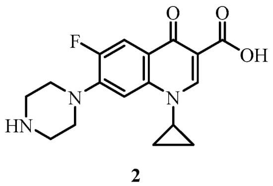 Ciprofloxacin 2 (Figure 3) is a fluoroquinolone antibiotic that acts by inhibiting the bacterial enzymes DNA gyrase (a type II topoisomerase) and topoisomerase IV, which are required for DNA replication [32,33]. Various structural modifications to the ciprofloxacin core have disclosed that the secondary amine of the piperazine ring at the 7-position represents a useful handle where further synthetic transformations can be performed without significantly affecting the antimicrobial activity of the molecule [34,35,36]. Furthermore, the addition of large substituents at the 7-position of fluoroquinolones does not adversely affect drug permeability through bacterial membranes [37] and the variety of piperazinyl substituents introduced at this position has revealed the looseness of the binding pocket of the targeted DNA gyrase [38,39,40].