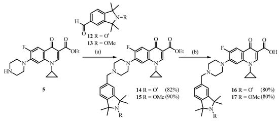 Ethyl 1-cyclopropyl-6-fluoro-4-oxo-7-(piperazin-1-yl)-1,4-dihydroquinoline-3-carboxylate 5 [44], 1-methoxy-2,2,6,6-tetramethyl-4-piperidinone 7 [51] and 5-formyl-2-methoxy-1,1,3,3-tetramethylisoindoline 12 [49] were prepared according to known procedures.