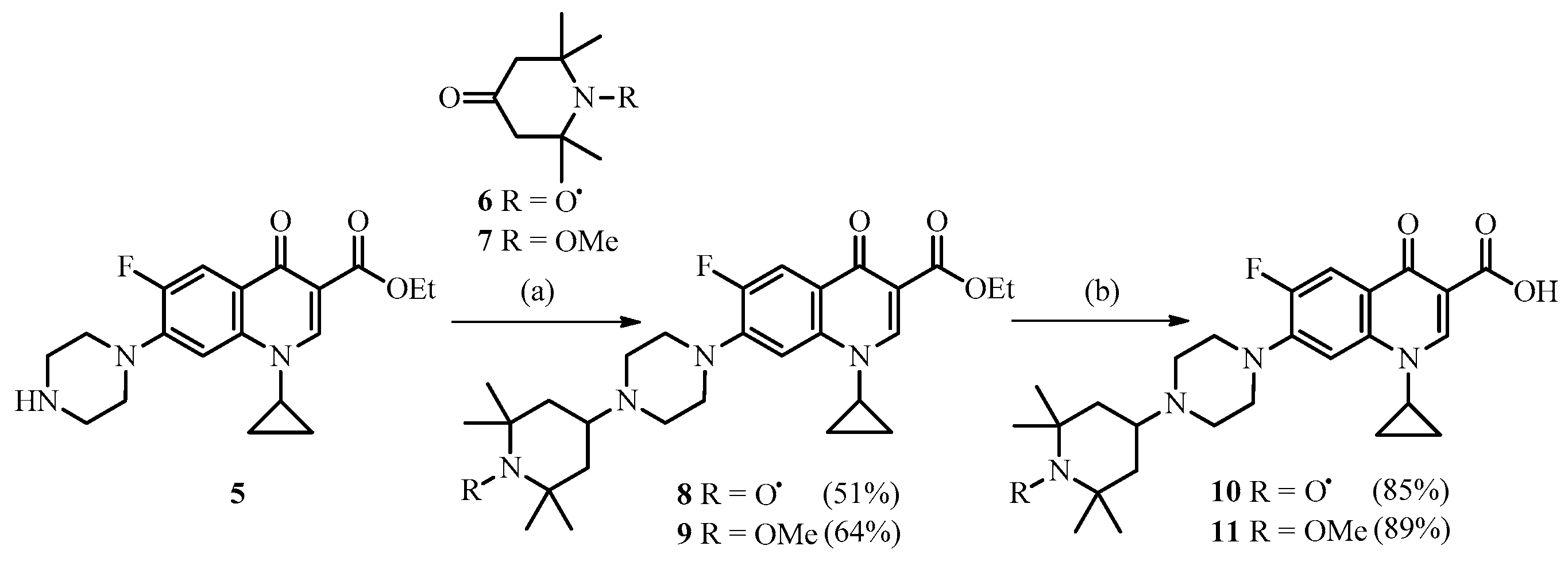 Synthetic route to ciprofloxacin-nitroxide hybrid 10 and its corresponding methoxyamine derivative 11. Reagent and conditions: (a) (i) AcOH, MeOH 60 °C, 2 h. (ii) NaBH3CN, 50 °C, 24 h; (b) 2 M NaOH, MeOH, 50 °C, 5 h.
