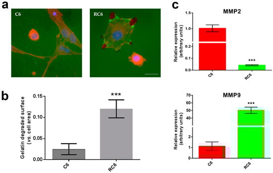 The proteolytic activity of C6 and RC6 cells was analyzed using Oregon Green® 488 Conjugate gelatin (Figure 2). The appearance of dark areas lacking fluorescence indicates the proteolysis of fluorescent gelatin. As shown in Figure 2a degraded areas were scarcely detected in the C6 cells whereas the presence of RC6 cells significantly increased the areas of degradation (~4 fold) compared to C6 (Figure 2b, *** p = 0.0007). Moreover, we demonstrated that MMP9 mRNA expression in RC6 cells overcomes the expression in C6 cells by 50 fold (Figure 2c, *** p = 0.0003) while the expression of MMP2 mRNA in RC6 cells is significantly decreased by 25 fold (Figure 2c, *** p = 0.0009).