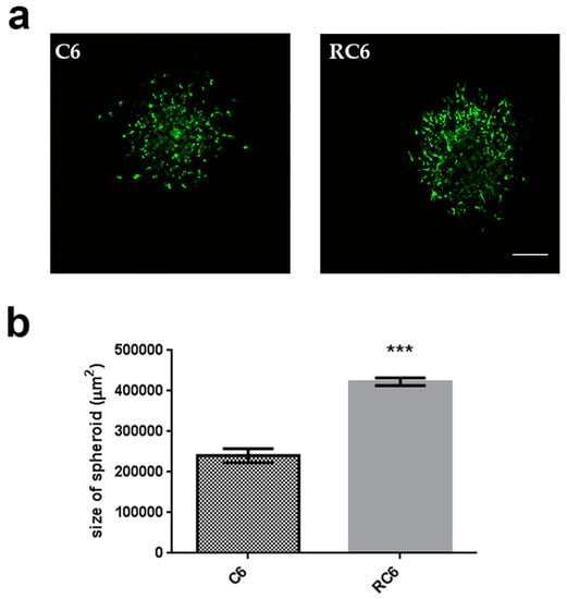 Next, the invasion of C6 and RC6 spheroids was assessed in 3D hydrogel (Figure 3). Both cell lines formed well defined uniform spheroids after 24 h using hanging drop method. Afterwards, spheroids were embedded in hydrogel for 24 h, and then stained with fluorescent dyes CAM and PI (Figure 3a). The fraction of cells invading hydrogel is expressed as a size of spheroids. Invasion of RC6 spheroids was significantly increased (~2 fold) compared to that of C6 spheroids (Figure 3b, *** p = 0.0007).