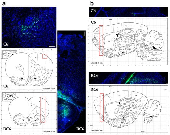 Invasion of C6 and RC6 cells 10 days after inoculation. (a) Representative images of coronal; (b) and sagittal sections of Wistar rat brain from C6 and RC6 group. Inoculated cells were stained with fluorescent dye FB (green). Nuclei were counterstained with PI (blue). Scale bar = 200 μm. Rat brain schemes were taken from Rat Brain Atlas [18].