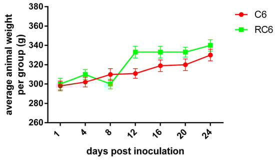 Average animal weight in C6 and RC6 group followed during 24 days after cells’ inoculation.