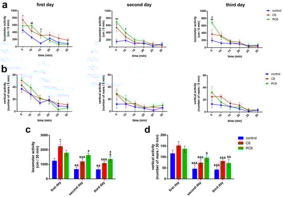 Motor activity and habituation of control, C6 and RC6 groups of the animals. (a) 5 min scores of locomotor activity; (b) and vertical activity of animals during 30 min period (intra-session habituation), across 3 consecutive days of registration; (c) Total locomotor activity; (d) and vertical activity of animals for the 30 min registration period during 3 consecutive days (inter-session habituation). p < 0.05 (*) C6 vs. control group; p < 0.05 (#) and p < 0.01 (##) RC6 vs. control group; p < 0.05 ($) RC6 vs. C6 group; p < 0.05 (&), p < 0.01 (&&) and p < 0.001 (&&&) second/third day vs. the first day of the same experimental group.