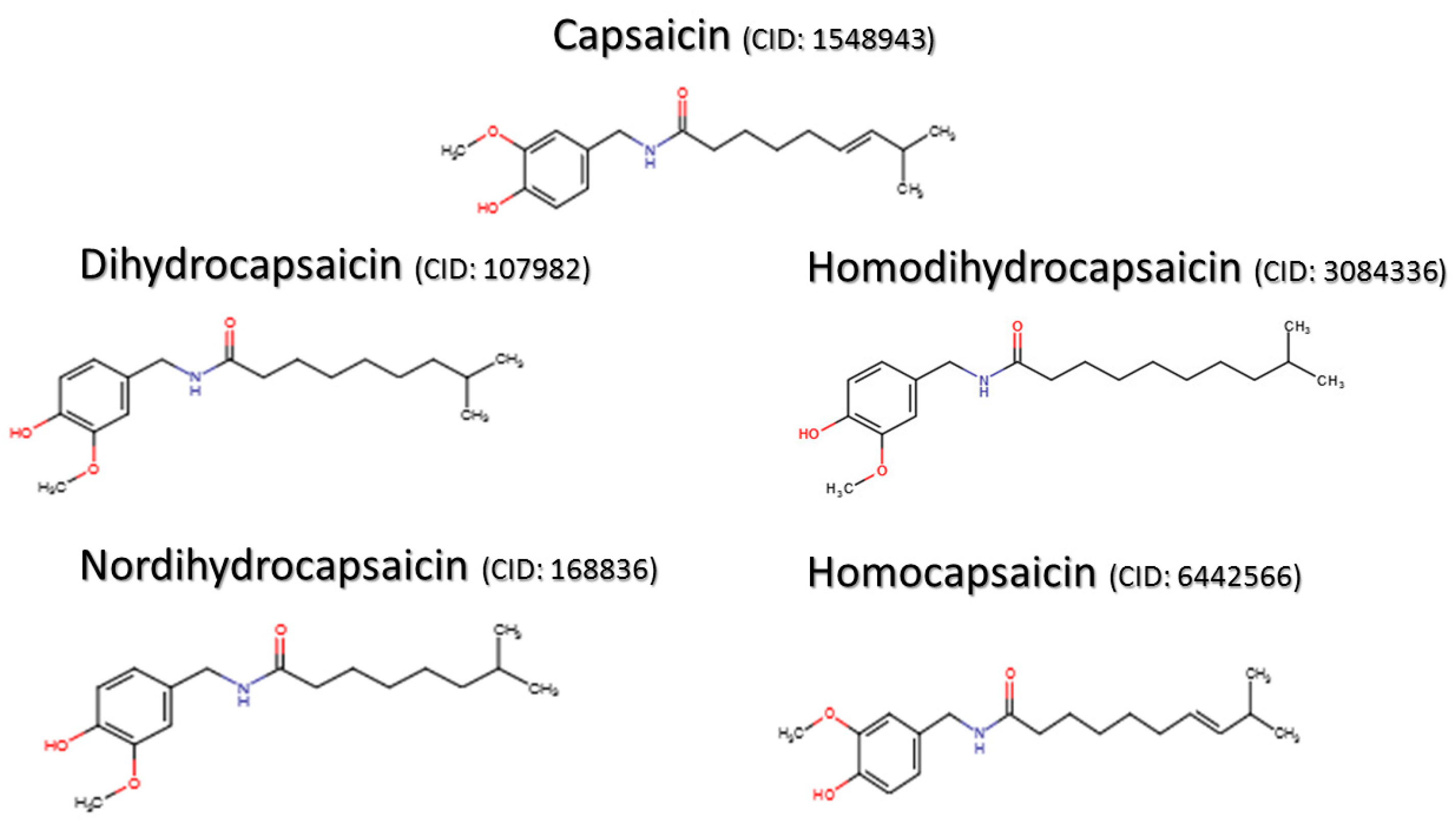 Chemical structure of capsaicin and capsaicinoids. Molecules of capsaicin and capsaicinoids available in PubChem database [12,13,14,15,16]. Compound identifier (CID) number is provided in parentheses. Molecules were drawn using Marvin JS, MarvinSketch in JavaScript.