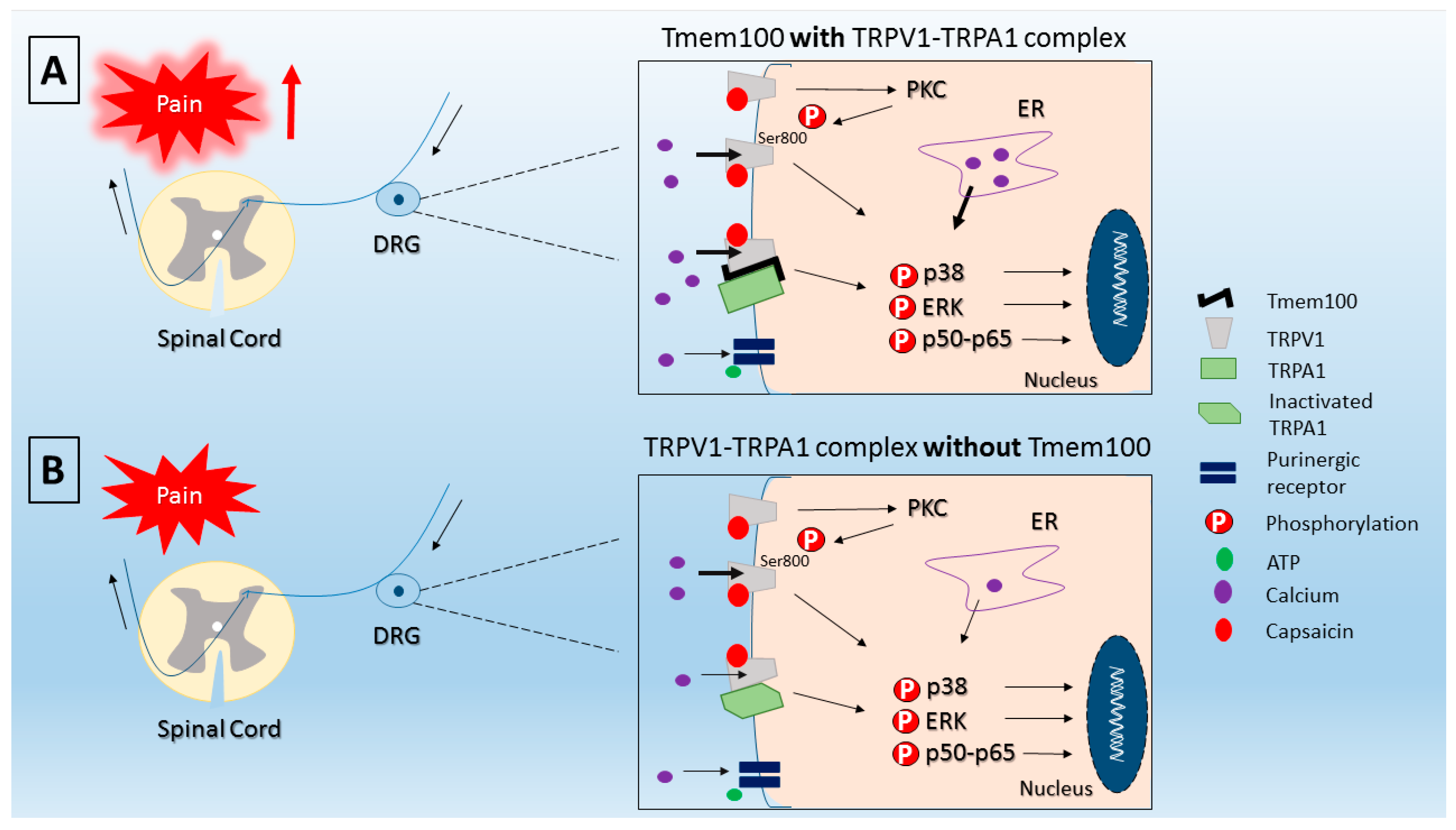 Mechanisms of capsaicin-induced pain. Schematic representation of the phosphorylation at Ser800, which allows TRPV1 discriminating cation influx [50], and participation of Tmem100 in the mechanism of capsaicin-induced pain [49,51,52]. In the presence of Tmem100 (A) activation of TRPV1-TRPA1 complex increases the influx of calcium and contributes to higher perception of pain. On the other hand, without Tmem100 (B) TRPV1-TRPA1 complex produces lower influx of calcium since TRPA1 is found in an inactivated conformation [49,51,52]. Black thin arrow: lower calcium influx; Black thicker arrow: higher calcium influx; DRG: dorsal root ganglion; ER: endoplasmic reticulum; PKC: protein kinase C.