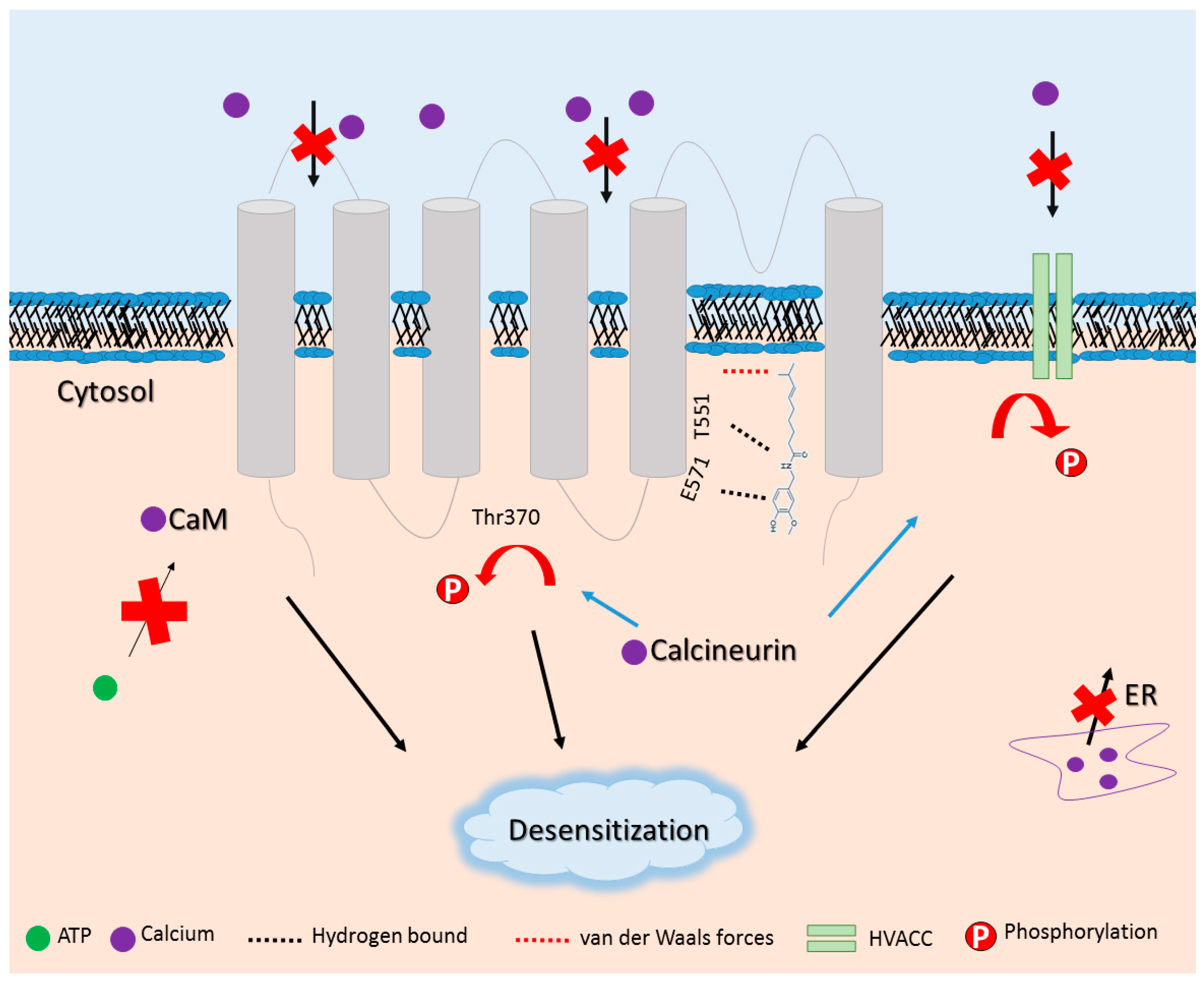 Mechanisms of capsaicin-TRPV1 interaction and desensitization. Capsaicin bounds to TRPV1 in a “’tail-up, head-down configuration” and increases the influx of calcium [50]. A secondary effect due to calcium influx is the activation of calcium-dependent enzymes, such as calcineurin, which dephosphorylates TRPV1 [55,56], downregulates HVACC [57], which culminates in TRPV1 desensitization. Additionally, CaM prevents ATP-induced sensitization of TRPV1 by competing for the same intracellular pocket [55]. CaM: calmodulin; HVACC: high voltage-activated calcium channels; ER: endoplasmic reticulum.