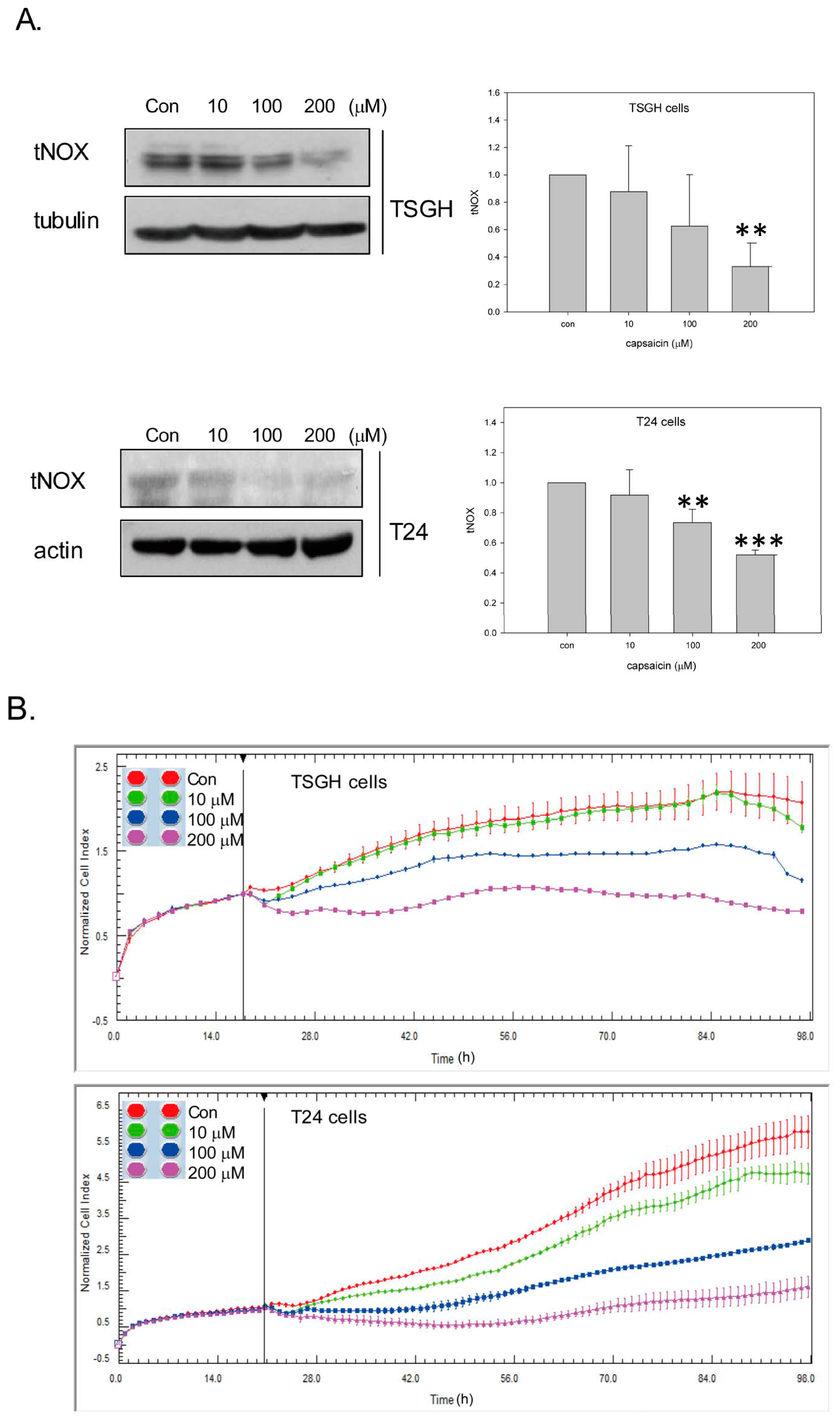 Capsaicin downregulates tNOX expression and inhibits cell growth in TSGH8301 (herein called TSGH) and T24 cells. (A) Cells were treated with capsaicin or ethanol for 18 h. Aliquots of cell lysates were separated by SDS-PAGE and analyzed by western blotting; β-actin (or tubulin) was used as an internal control. Representative images from four experiments are shown. The intensity of a protein band was quantified by Gel-Pro Analyzer software 3.1. The resultant values of protein expression were normalized to those of actin. Values (mean ± SE) are from three independent experiments (** p < 0.01, *** p < 0.001); (B) Cell growth with or without capsaicin was dynamically monitored using impedance technology. Normalized cell index values measured over 96 h are shown.