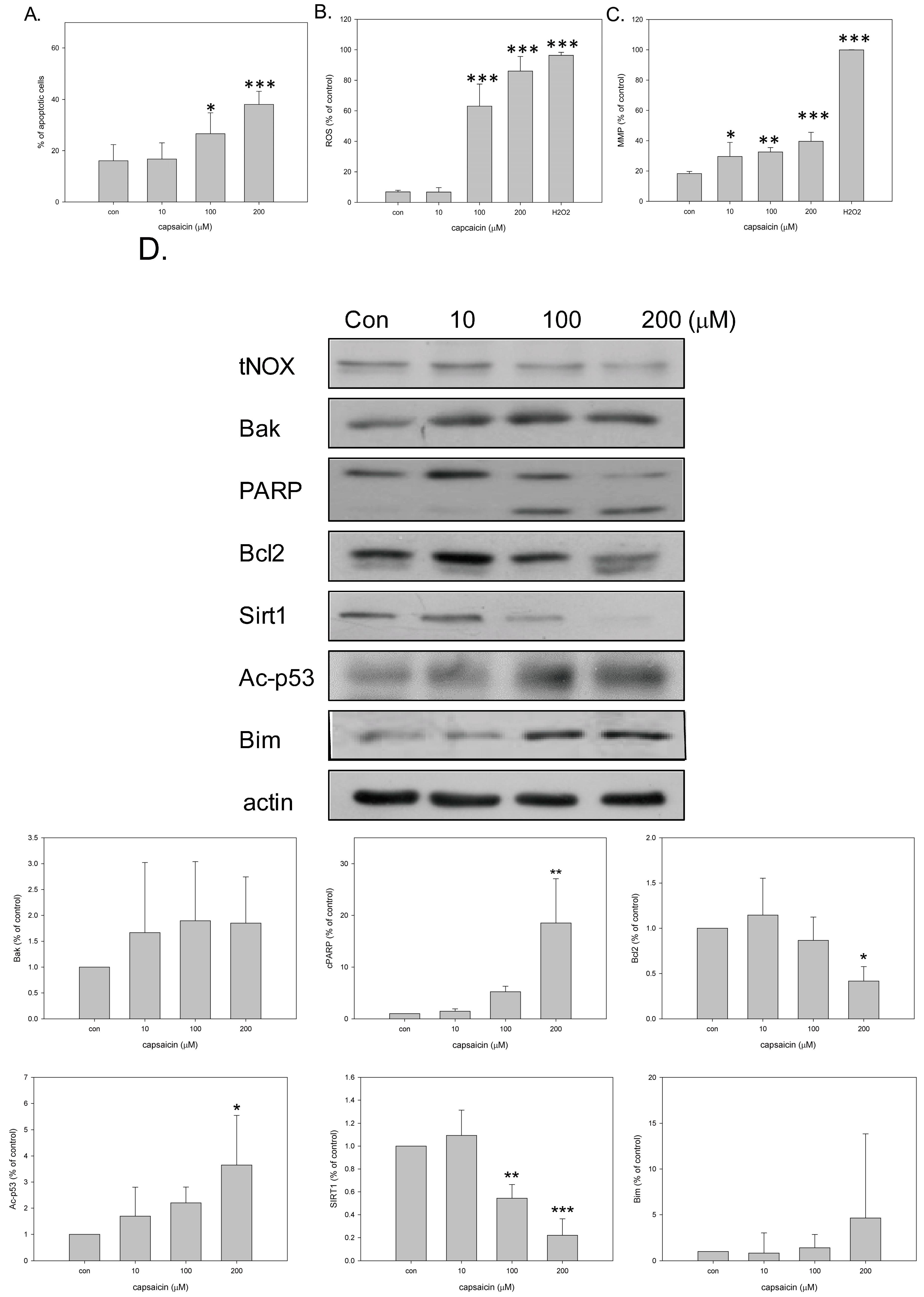 Previous studies suggest that SIRT1 negatively regulates the expression of the tumor suppressor, FOXO3 [29], and FOXO3 is a key transcription factor for upregulation of the apoptotic protein Bim [30]. Consistent with these, we observed that capsaicin treatments (i.e., SIRT1 downregulation) enhanced the expression level of Bim (Figure 2D).