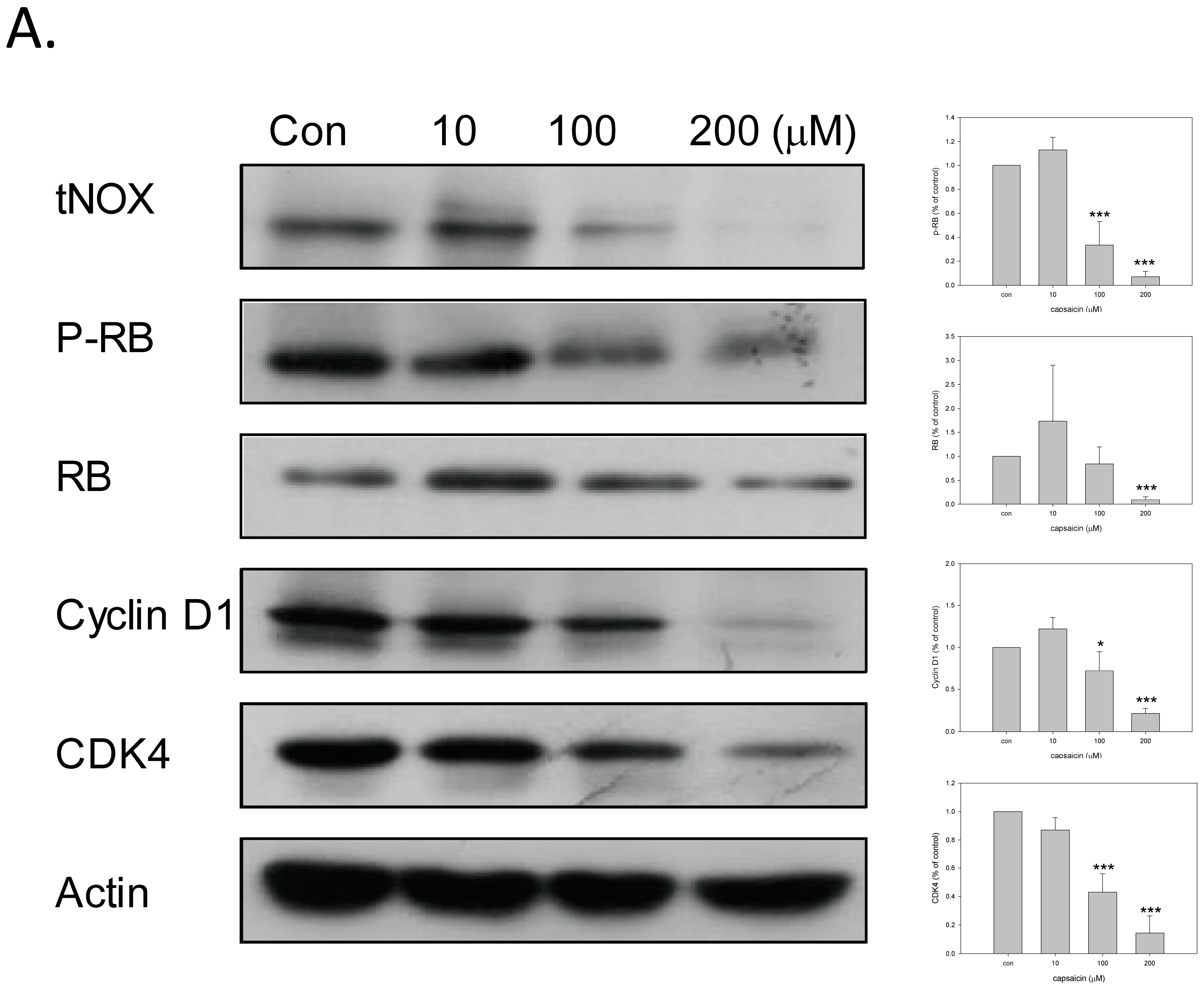 To further assess the anti-proliferative effect of capsaicin, we examined changes in the cell cycle distributions. Western blot analyses revealed that capsaicin downregulated tNOX expression, and further revealed downregulation of phosphorylated Rb and cyclin D, which are involved in cell cycle progression (Figure 3A). Cell cycle determination also confirmed that capsaicin significantly enhanced cell arrest at G1 phase at 100 and 200 μM (Figure 3B).