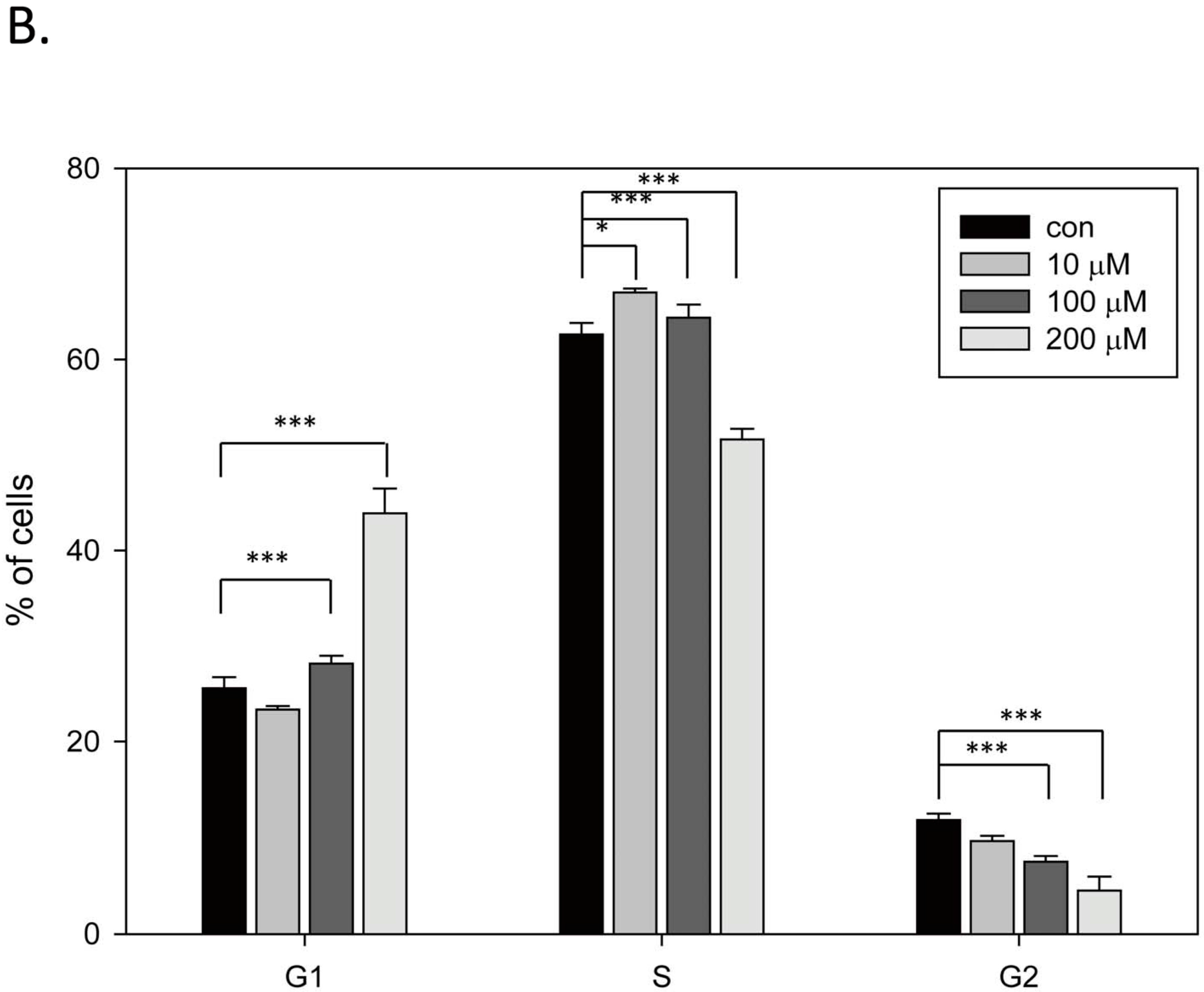 Capsaicin induces cell cycle arrest. TSGH cells were treated with capsaicin or ethanol for 18 h. (A) Aliquots of cell lysates were separated by SDS-PAGE and analyzed by western blotting. β-actin was used as an internal control. The intensity of a protein band was quantified by Gel-Pro Analyzer software 3.1. The resultant values of protein expression were normalized to those of actin. Values (mean ± SE) are from three independent experiments (*** p <0.001); (B) Cells were assayed for cell cycle phase. The graphs are representative of three independent experiments. Values (mean ± SE) are from three independent experiments. The percentage of cells in G1 phase was significantly higher in cells treated with 100 and 200 μM capsaicin compared to cells in the control group by one-way ANOVA with LSD (* p < 0.05, *** p < 0.001).