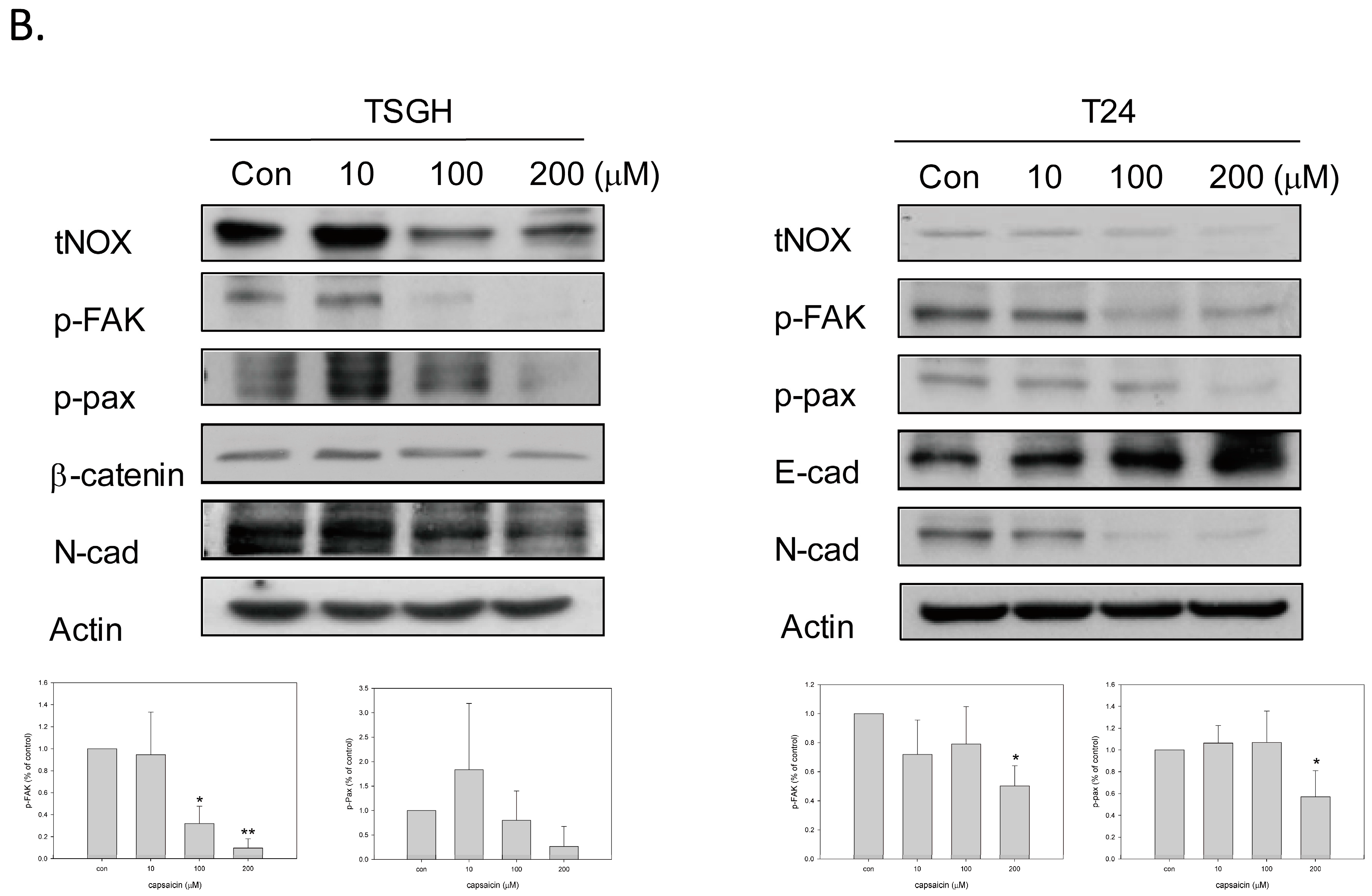 Given that gain- and loss-of-function approaches showed that the expression level of tNOX is relevant to cell migration [27,31], we used cell impedance measurements to examine the effect of capsaicin on the migration of bladder cancer cells. We found that 100 and 200 μM capsaicin effectively attenuated cell migration in both TSGH cells and T24 cell lines (Figure 4A). Interestingly, cell migration was somewhat increased with 10 μM accompanied by up-regulation of tNOX expression, that is consistent with our previous findings in HCT116 cells [32]. Mechanistically, 100 and 200 μM capsaicin inhibited ERK downstream targets, paxillin and FAK, which are all important for cell migration regulation (Figure 4B). The attenuated cell migration was also associated with the downregulation of transcription factors β-catenin, leading to a decrease in mesenchymal marker N-cadherin and an increase in epithelial marker E-cadherin (Figure 4B).