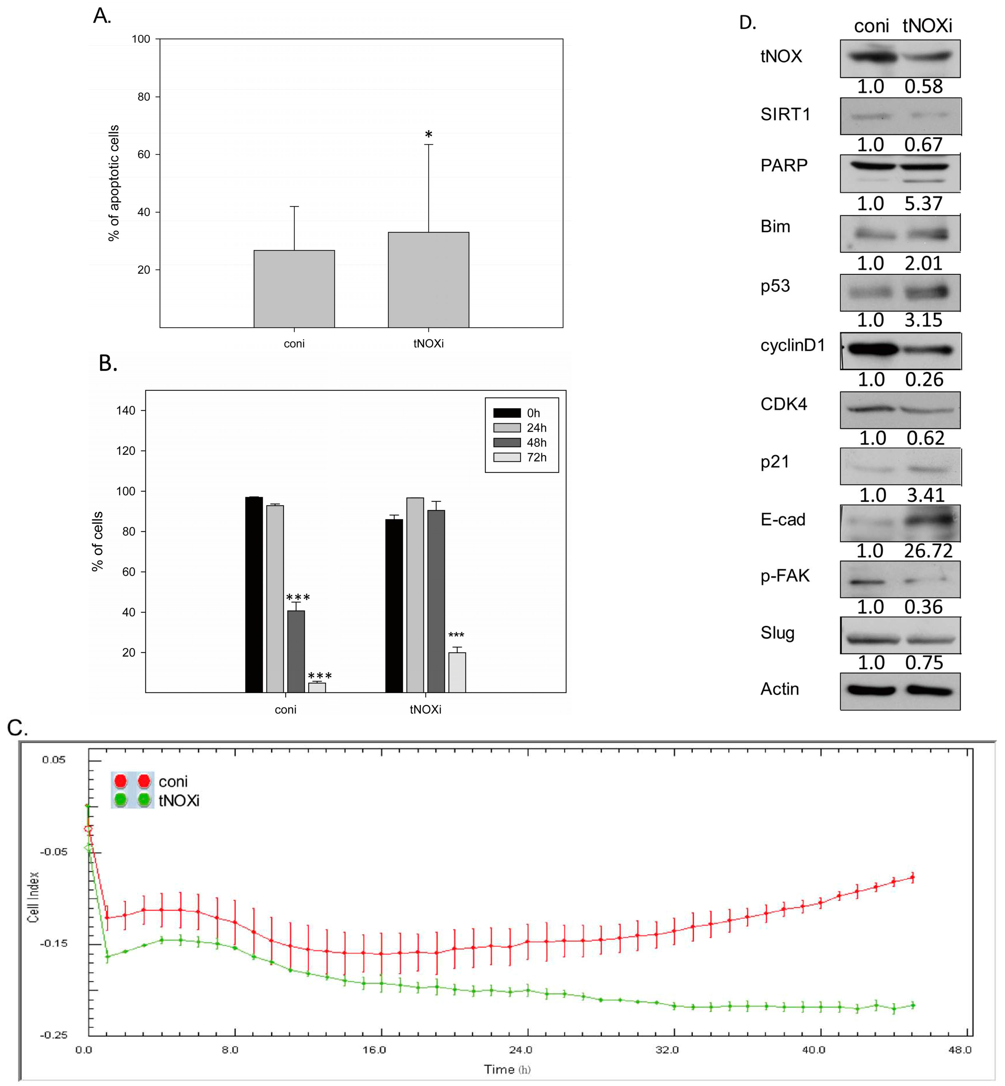 Next, we used RNA interference to examine whether tNOX is essential for cancer phenotypes of TSGH cells. Indeed, tNOX depletion was found to significantly increase spontaneous apoptosis (Figure 5A), increase the doubling time (Figure 5B), and decrease cell migration (Figure 5C). We also observed downregulation of SIRT1 in these tNOX-knockdown cells (Figure 5D). The results from protein analyses (Figure 5D) further supported the notion that tNOX knockdown-mediated SIRT1 downregulation reduces the cancer phenotypes of these cultured bladder cancer cells, demonstrating an increase in levels of Bim, caspase 3-direct PARP cleavage, and p53 (enhanced apoptosis), changes in levels of cyclin D, CDK4, and p21 (prolonged cell cycle progression), an increase in E-cadherin while FAK and slug are downregulated (attenuated cell migration).