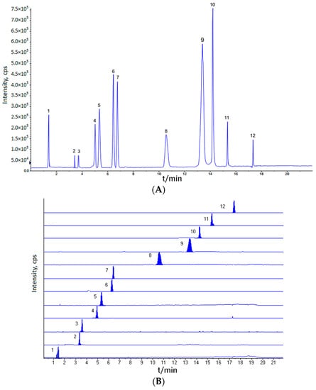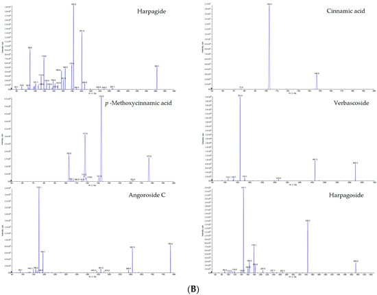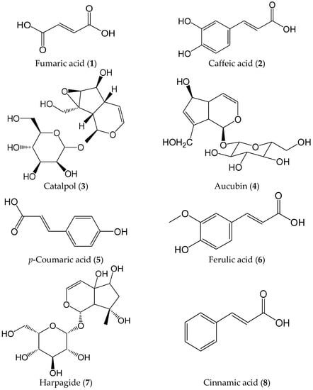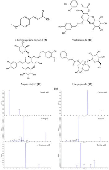 The chemical standards harpagide (1), harpagoside (2), ferulic acid (3), catalpol (4), aucubin (5), cinnamic acid (6) , and caffeic acid (7) were purchased from the Chinese National Institute of Control of Pharmaceutical and Biologiceal Products (Beijing, China); angoroside C (8) was purchased from Chengdu Chroma-Biotechnology Co., Ltd. (Chengdu, China); verbascoside (9) was purchased from Shanghai Yongye-Biotechnology Co., Ltd. (Shanghai, China); p-Coumaric acid (10) and p-methoxycinnamic acid (11) were purchased from Shanghai Yuanye-Biotechnology Co., Ltd. (Shanghai, China); fumaric acid (12) was purchased from Sinopharm chemical reagent Co., Ltd. (Nanjing, China). The purity of all chemical standards is greater than 99% (Figure 2). Methanol and acetonitrile of HPLC grade were purchased from Merck (Damstadt, Germany). Ultrapure water was prepared using a Milli-Q purifying system (Millipore, Bedford, MA, USA) under a resistivity of 18.2 MΩ/cm, other reagent solutions were analytical grade (Sinopharm Chemical Reagent Co., Ltd., Shanghai, China).