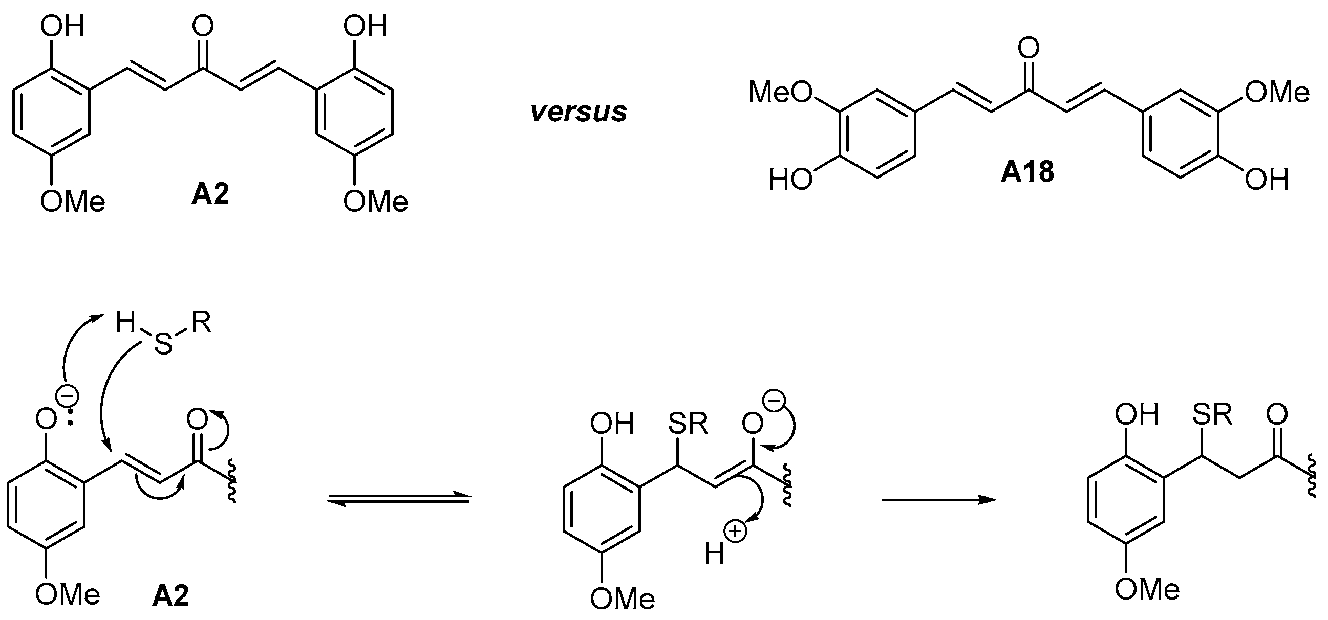 Curcumin and curcuminoids are bis(Michael acceptors) and are also related to unsaturated Mannich bases (Figure 1), which possess two electrophilic centers: (i) the α,β-unsaturated ketone is visible per se; and (ii) the other is masked and revealed only after a base-dependent deamination of the α-amino ketone. Michael addition of two nucleophiles (e.g., thiols from proteins) leads to a bis(adduct) product, upon an elimination of the dialkylamino group promoted by a base-catalyzed enolization of the ketone. From a screening of 350,000 compounds of the Pfizer library, unsaturated Mannich bases were identified to be efficient mechanism-based inhibitors of P. falciparum TrxR [17]. Induction of ROS by curcuminoids and related unsaturated Mannich bases has been proposed to occur via redox-cycling following Michael addition of thiols to the enone, sulfide oxidation, syn-elimination, irreversible formation of thiol overoxidation and continuous NADPH consumption [31,44].