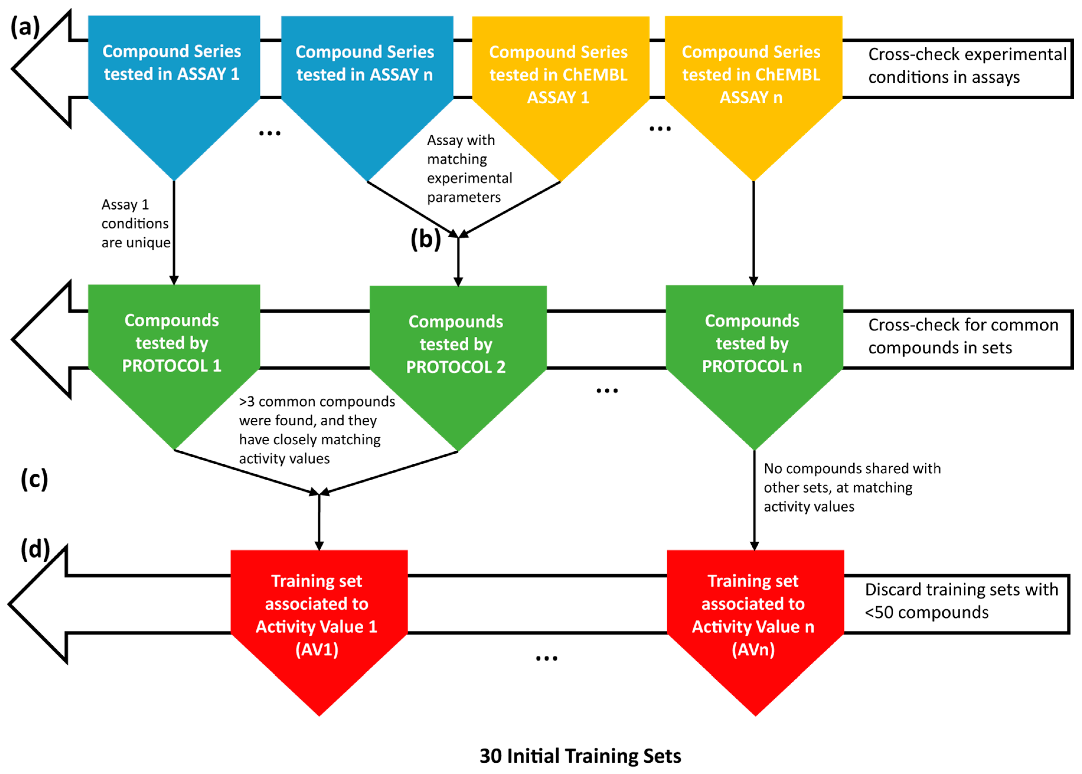 Eventually, a number of 30 training sets, all selected because (1) each contained more than 50 molecules and (2) they span a significant activity range (i.e., contain both active and inactive), were saved in the local database (Figure 3d). Some of these sets can be directly traced back to the assay ChEMBL ID, meaning that these are single source series. They will be further on referred to by the actual assay ChEMBL ID. Sets regrouping in-house molecules with compounds from one or several ChEMBL assays considered to be based on a common protocol are fused sets and will be labelled as “FS”, followed by the protocol ID number as listed in the in-house database. Moreover, fused sets regrouping entries tested in different, but allegedly compatible protocols will be named “FS” followed by the “+”-separated concatenation of the merged protocol numbers.