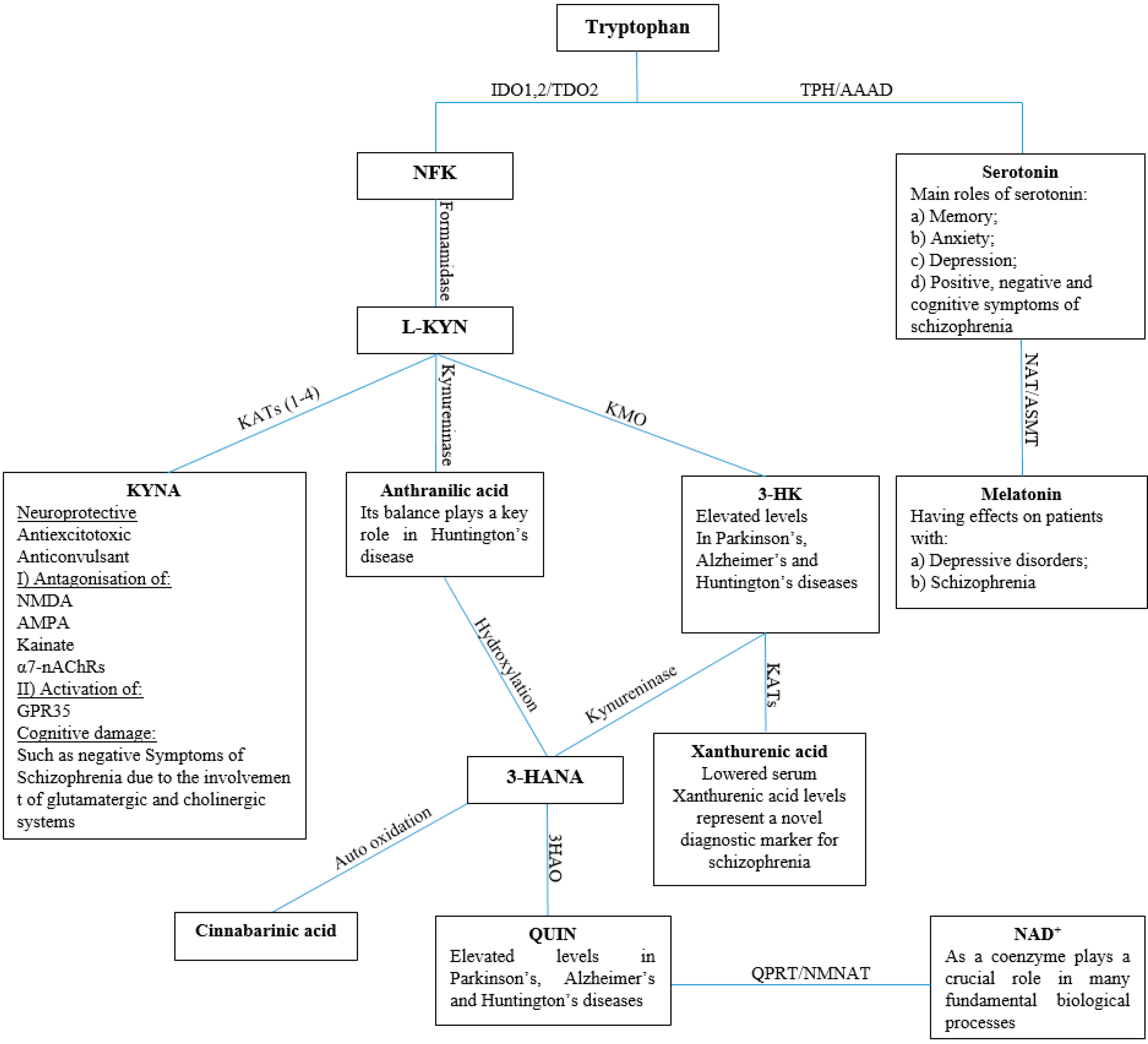 The tryptophan catabolic pathway consists of two routes. One is serotonin biosynthesis, the route which is determined by the amount of tryptophan which can cross the blood-brain barrier (BBB). As illustrated, two enzymes transform tryptophan into serotonin: first tryptophan hydroxylase (TPH) hydroxylates tryptophan into 5-hydroxytryptophan and then in the second step l-aromatic amino acid decarboxylase (AAAD) decarboxylases 5-hydroxytryptophan into serotonin. Serotonin is consequently transformed to an active metabolite, melatonin, via two-steps of enzymatic catabolism. Firstly, serotonin is transformed to N-acetylserotonin via acetylation of its amine group by N-acetyl transferase (NAT), and then acetylserotonin O-methyltransferase (ASMT) catalyzes the subsequent transformation, converting normelatonin to melatonin. The second route is known as the kynurenine pathway, which is the main route of tryptophan metabolism. This pathway is started by the conversion of tryptophan to N-formylkynurenine (NFK) by indoleamine 2,3-dioxygenase 1 (IDO1) and tryptophan 2,3-dioxygenase 2 (TDO2). L-KYN is obtained by the metabolism of NFK by formamidase. There are three branches for subsequent L-KYN metabolism. One is in which it is converted irreversibly into KYNA by kynurenine aminotransferases (KATs) isozymes. In the other branches, kynurenine 3-monooxygenase (KMO) and kynureninase transform L-KYN into 3-hydroxykynurenine (3-HK) and anthranilic acid, respectively. After that, anthranilic acid and the 3-HK are transformed by hydroxylation or kynureninase to a mutual product: 3-hydroxyanthranilic acid (3-HANA), and in the second step of the branch the 3-HK acts as a substrate of the KAT isoenzymes, and is catalysed into xanthurenic acid. An auto oxidation reaction converts 3-HANA into cinnabarinic acid; alternatively, 3-HANA is transformed into quinolinic acid (QUIN) by 3-hydroxyanthranilic acid 3,4-dioxygenase (3HAO). In the last steps of this branch, one of the crucial mammalian cofactors, nicotinamide adenine dinucleotide+ (NAD+), is produced by quinolinate phosphoribosyl transferase (QPRT) and nicotinamide nucleotide adenylyl transferase (NMNAT), respectively.