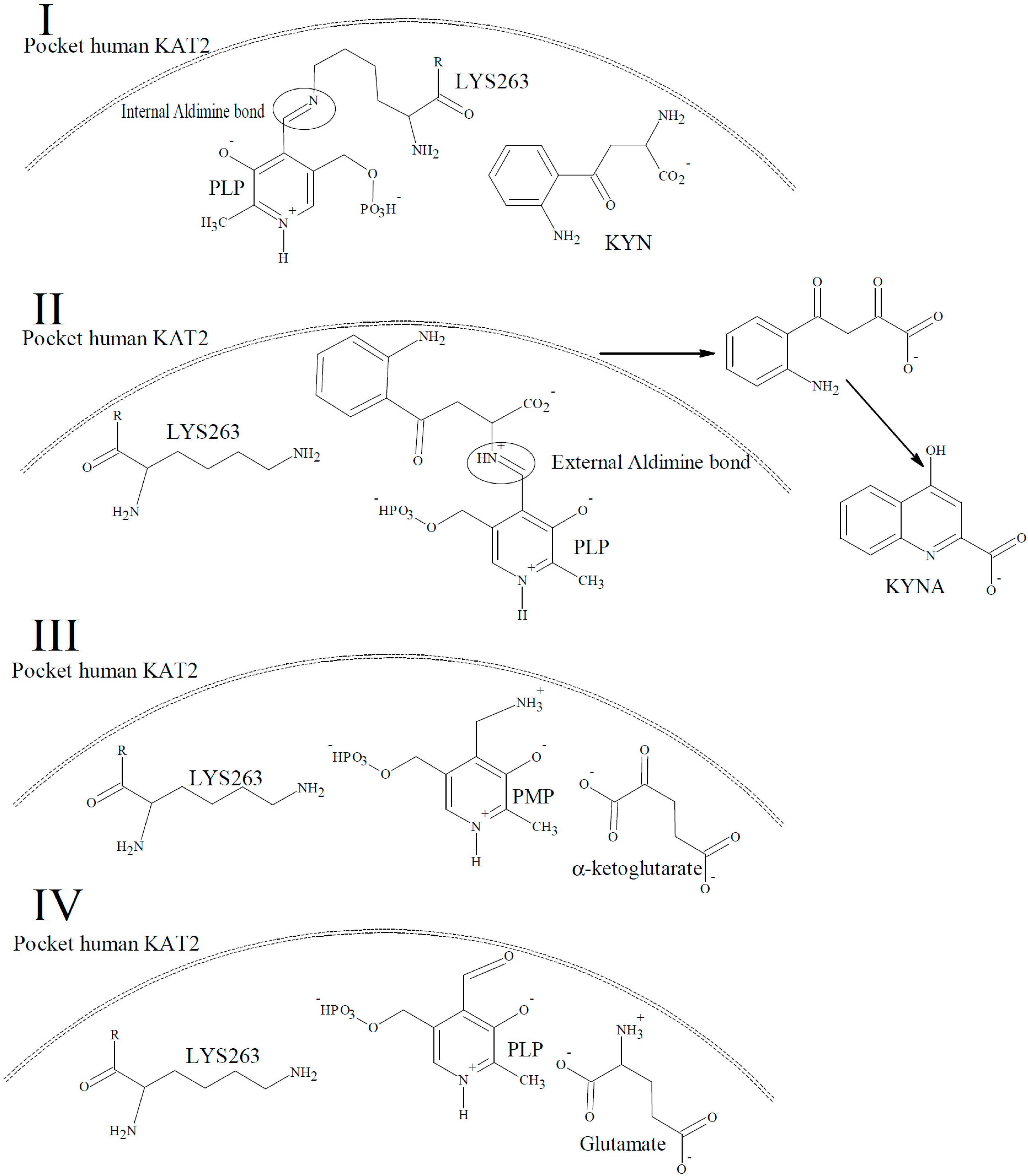 The mechanism of the human KAT-2 catalytic cycle. (I) PLP is covalently bound to LYS263 in the reaction pocket of human KAT-2 by an internal aldimine linkage in the native form of the enzyme; (II) The α-amino group of KYN in the active site binds to PLP via an external aldimine bond, and breaks the internal aldimine bond. Spontaneously ring closure of the α-keto analogue yields KYNA. (III) The α-amino group of the external aldimine bond from the previous step is transferred to the PLP, and of the production of KYNA simultaneously allows the formation of pyridoxamine phosphate (PMP); (IV) The regeneration of PLP from PMP is accomplished by converting the co-substrate, α-ketoglutarate, to glutamate by transferring the amino-group of PMP to the α-ketoglutarate, and consequently the PLP-form of the enzyme (I) is regenerated.