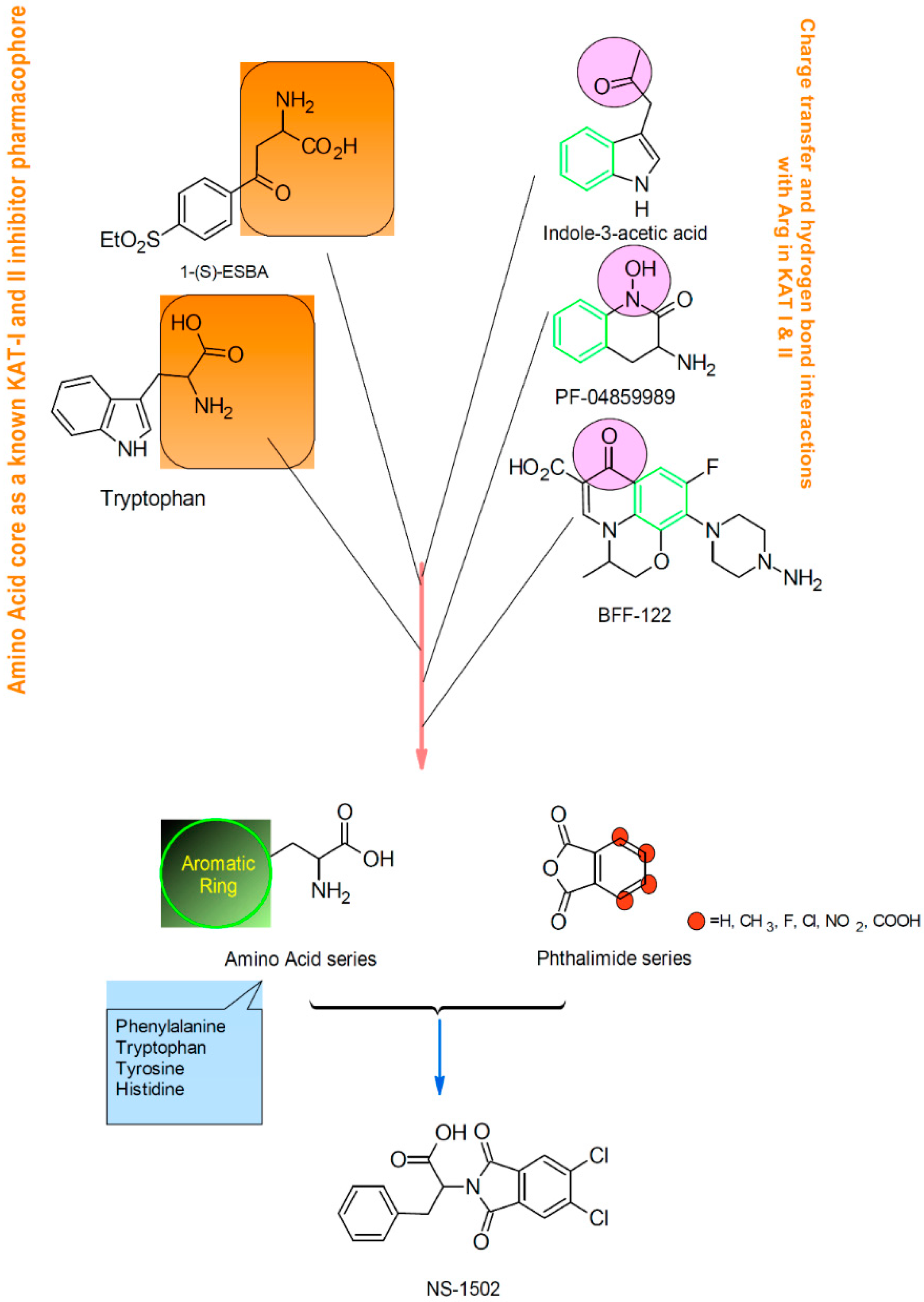 NS-1502 was designed on the basis of existing KATs inhibitors and compounds involved in the kynurenine pathway. The left branch of the design is on the basis of the similarity of (S)-ESBA to KYN, and tryptophan, the right side of the design scheme is based on the pharmacophore of the most potent available KAT-2 inhibitors (BFF-122 and PF-04859989) and general KATs inhibitor (indole-3-acetic acid).