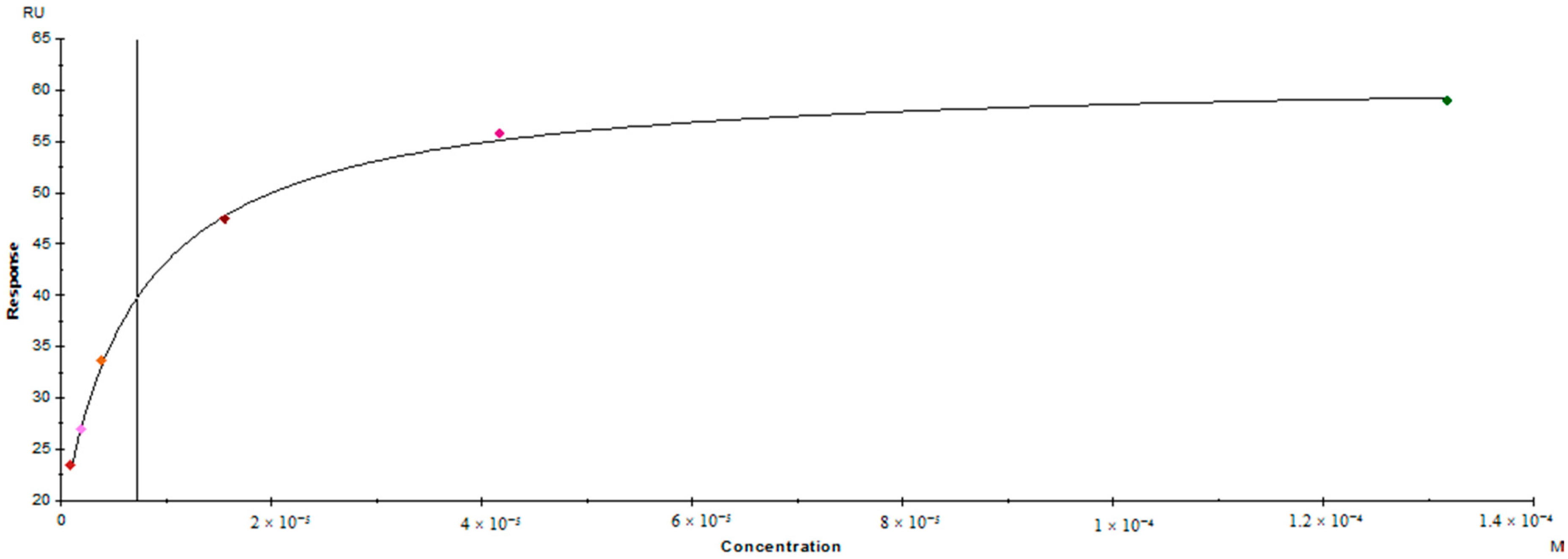 To examine the affinity of the interaction between KAT-2 and NS-1502, we used surface plasmon resonance as a highly sensitive assay that measures changes in the refractive index of the surface of the sensor chip. We were able to achieve sufficient binding levels of KAT-2 onto a CM5 chip via the amine coupling, (20602 RU) to enable quantification of the subsequent analyte interaction with the NS-1502. Solvent corrections were applied to the analysis, and the data demonstrated clear interactions between NS-1502 and KAT-2 in comparison to the referenced flow cell. A steady state affinity model was generated to fit the reference data (Figure 5), showing that NS-1502 binds to KAT-2 with suitable affinity (KD: 7.2 × 10−6, chi2: 0.34).