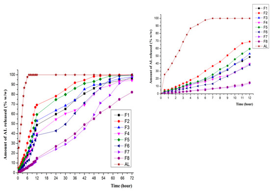 In vitro dissolution release of AL in phosphate buffer pH 7.4 (left—72 h; right—the first 12 h).